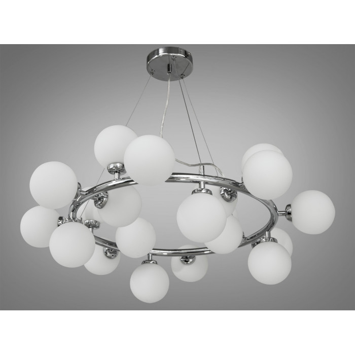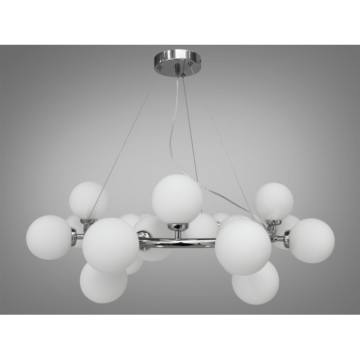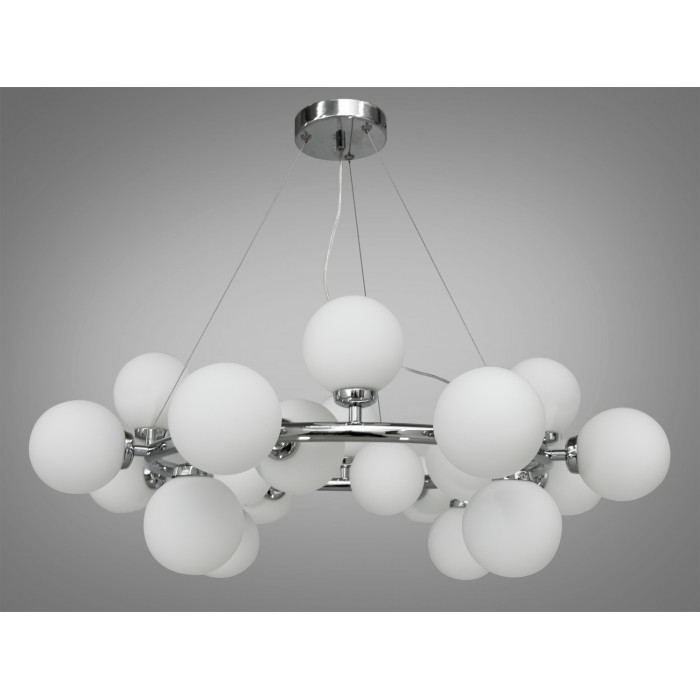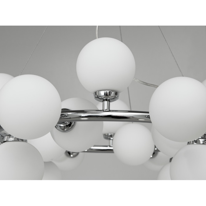 Люстра с двадцатью матовыми белыми плафонами, похожими на воздушные пузырьки, создает неповторимую игру света и тени. Мягкий рассеянный свет наполняет комнату уютом и спокойствием, делая ее идеальной для отдыха и приема гостей. Хромированное покрытие и прочная металлическая конструкция гарантируют долговечность и стойкость к времени.