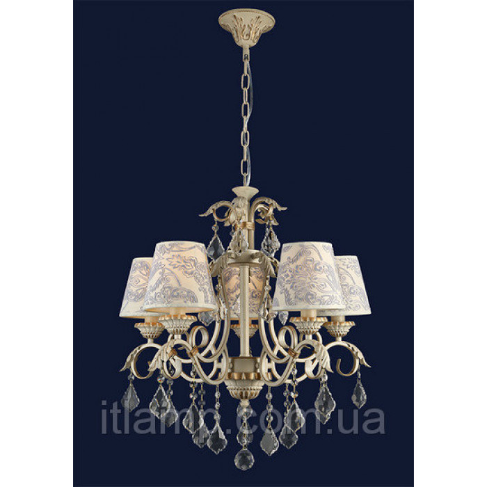 Люстра классическая абажурная. Цвет каркаса - бежевый. Люстра украшена хрустальными подвесками. Тип крепления - на крюк. Высота регулируется при помощи цепи. Размер 590 на 600 мм.