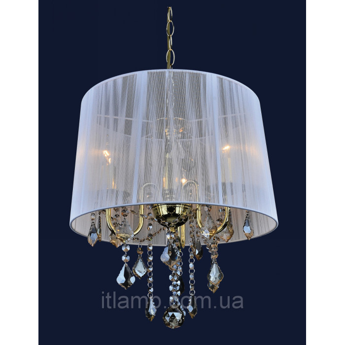 Люстра с абажуром. Точная копия итальянской люстры. Цвет каркаса - хром или золото на Ваш выбор.Цвет хрусталя - прозрачный с серебром или бежевый с золотом. Цвет абажура - белый,бежевый, серебристый, коричневый, черный. Размер люстры 400X350 мм. Количество ламп - 3*60 Вт. Патрон Е14.