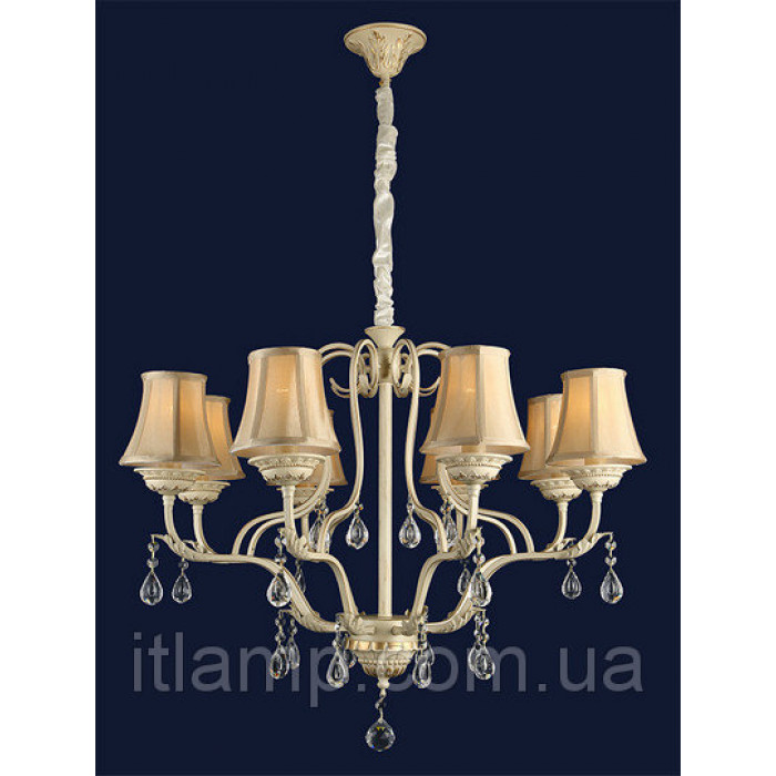 Светильник выполнен в классическом стиле. Цвет каркаса- бежевый с золотом. Люстра украшена красивым хрусталем формы капли . Абажур выполнен из ткани. Тип крепления - на крюк. Размер 780 на 560 мм.
