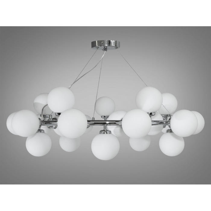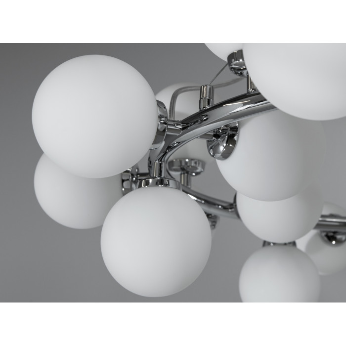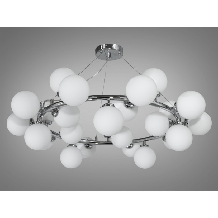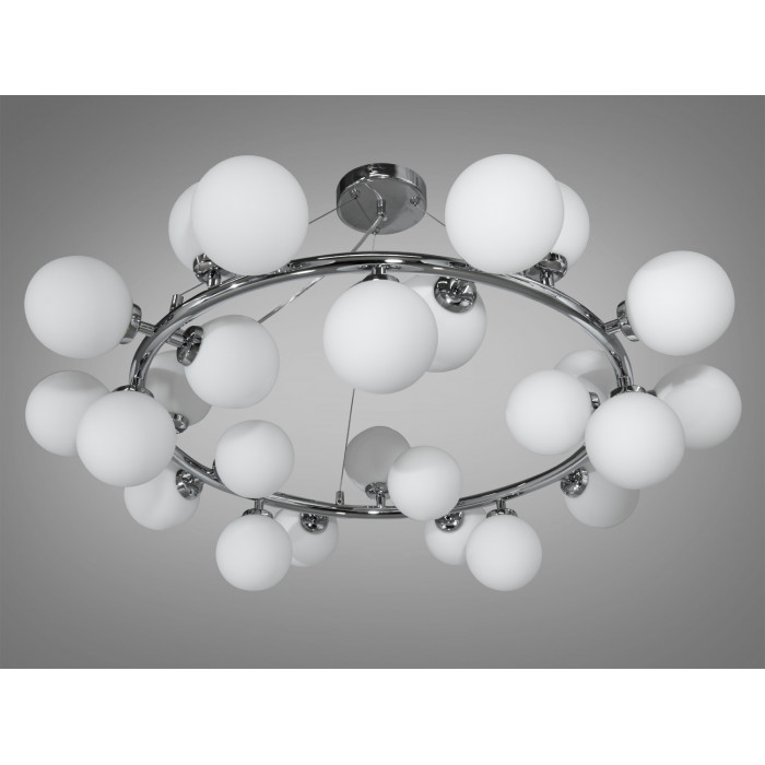 Конструкция выполнена из металлического кольца, на котором расположены 25 матовых стеклянных шаров. Рассеянный мягкий свет создаёт уют и не слепит глаза, обеспечивая приятное освещение в помещении любого назначения.
