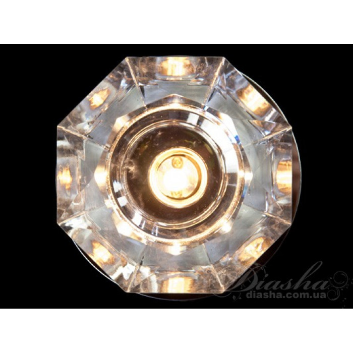Світло від лампи G5.3, що є серцем цієї світлової композиції, м'яко випромінюється крізь прозорість кришталевого плафона, створюючи теплу та затишну атмосферу. Позаду кришталю розташована хромована світловідбивна основа, яка не тільки додає блиску, але й функціонально віддзеркалює світло, збільшуючи ефективність освітлення та візуально розширюючи простір.