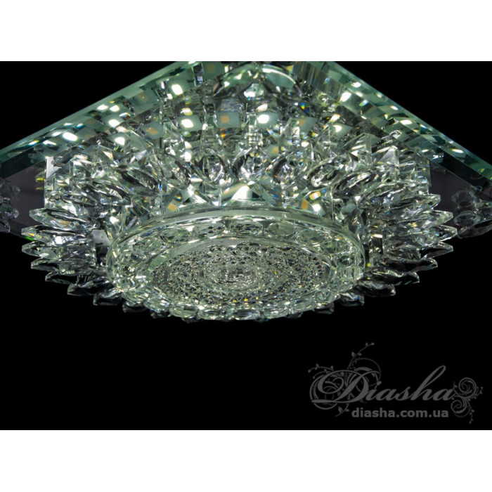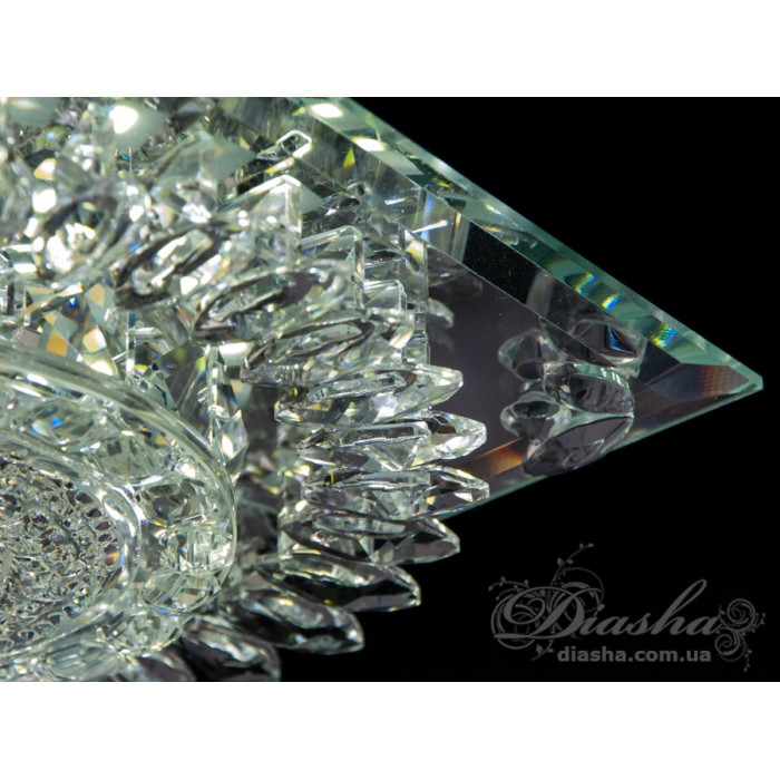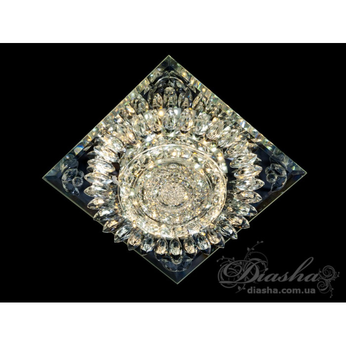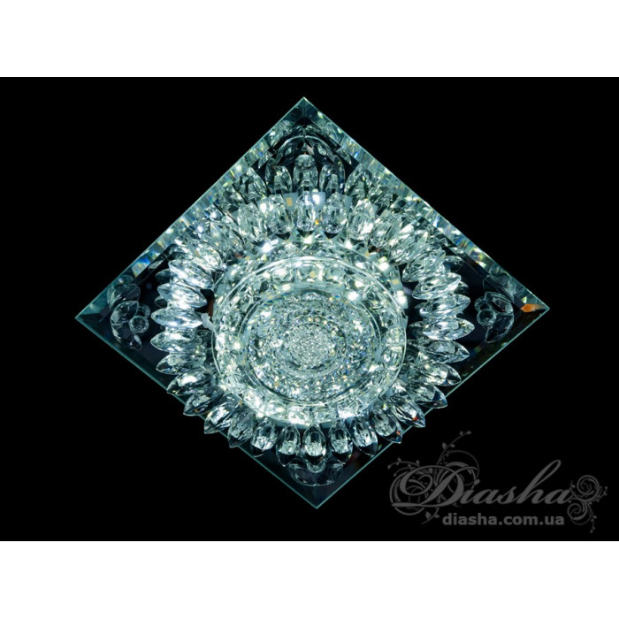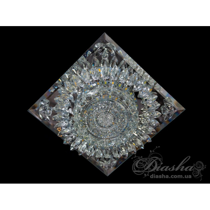 Кришталевий точковий врізний світлодіодний світильник квадратної форми від ТМ "Діаша", який вирізняється своїм блискучим та розкішним зовнішнім виглядом. Світильник складається з множини прозорих кришталів, вироблених з високоякісної оптичної смоли, що створюють ефект глибокого блиску та розсіюють світло в унікальні візерунки по всьому простору. Кришталі влаштовані концентричними рядами навколо центрального освітлювального елемента, додавши динамічності та візуального інтересу.