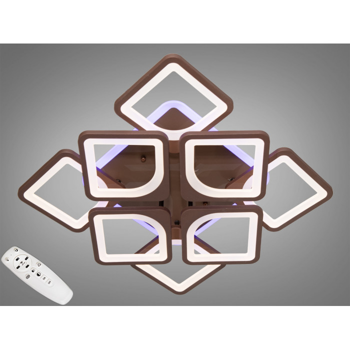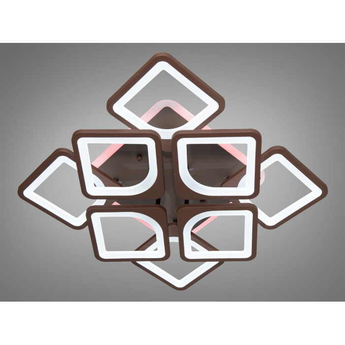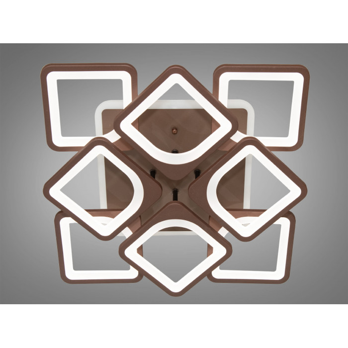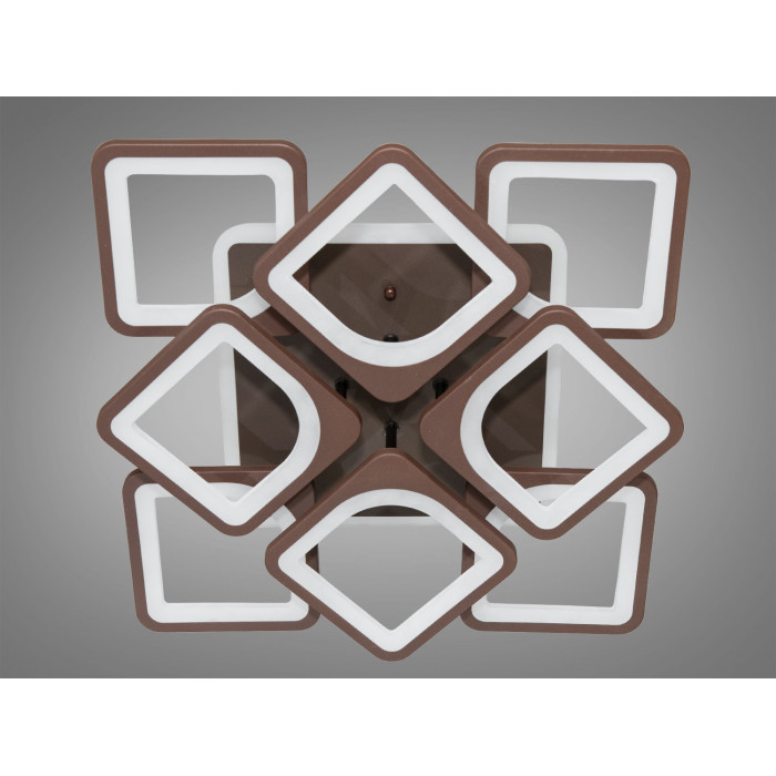 Лед люстра на стелю складається з восьми заокруглених квадратних плафонів з акрилу, які створюють зачаровуючий візуальний ефект, ніби плаваючи в повітрі. Коричневий колір додає тепла і глибини її зовнішньому вигляду, тоді як внутрішній контур квадратів, прикритий білим матовим акрилом, делікатно розсіює світло світлодіодів, створюючи м'яке і затишне освітлення.