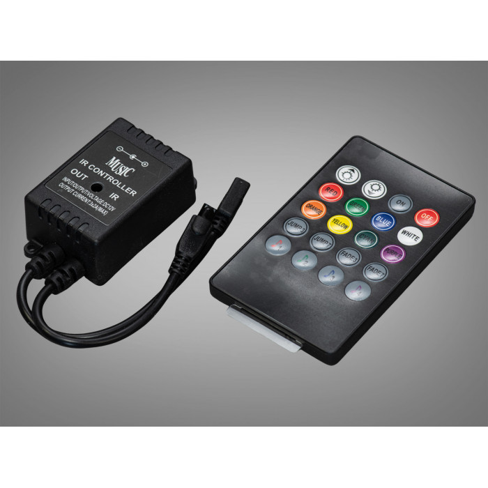 Він підтримує інфрачервоне управління RGB LED підсвічуванням через пульт із 20 зручними кнопками. Це дозволяє швидко перемикати режими, кольори та рівні яскравості. Контролер з вбудованим мікрофоном для LED стрічки реагує на звуки в навколишньому середовищі, синхронізуючи світлові ефекти з музикою.