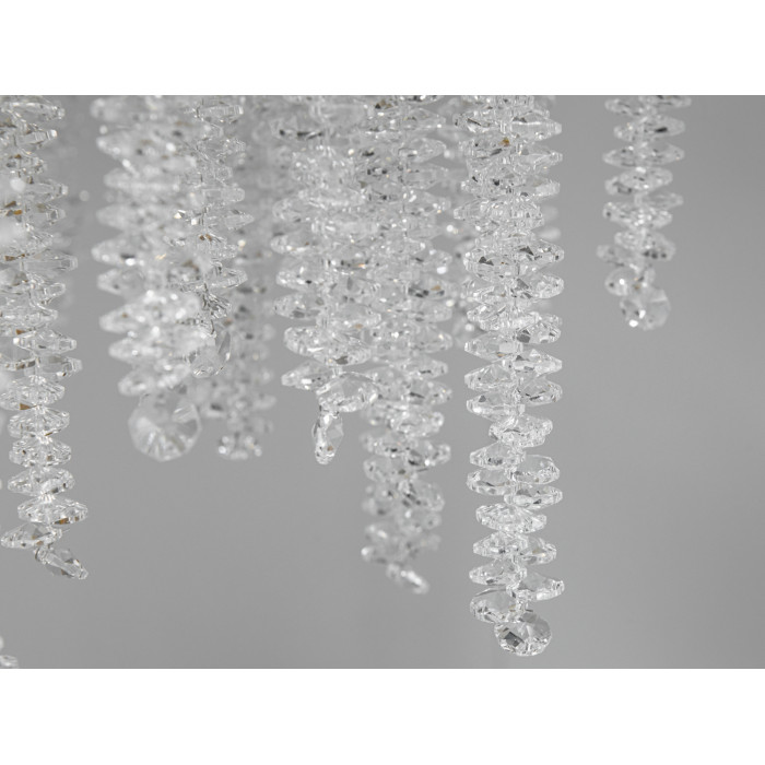 Каркас із алюмінію надає конструкції міцності та легкості, дозволяючи великій кількості кришталів здаватися, ніби плаваючими у повітрі. Вишуканість матеріалу та витонченість дизайну роблять цю люстру ідеальним вибором для тих, хто прагне купити люстру в зал. Вона не лише освітлює простір, але й створює в ньому атмосферу світла та простору, немов запрошує весняний сад у ваш дім.