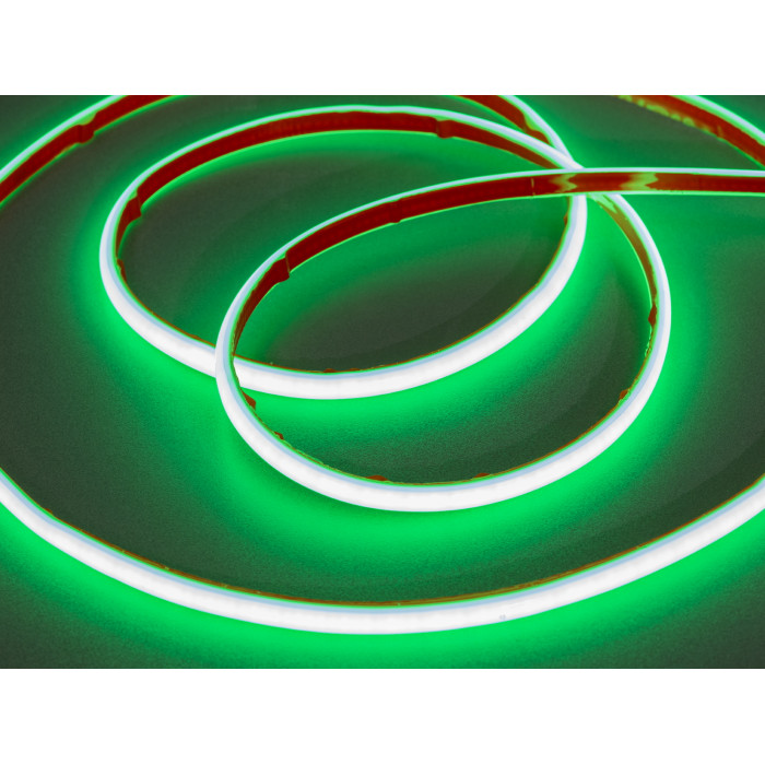 COB led стрічка з зеленим світлом створює атмосферу свіжості, натхнення та природного затишку. Вона гармонійно вписується у ландшафтний дизайн, акцентує зелень у дворі, освітлює декоративні конструкції та надає особливої естетики зовнішнім архітектурним елементам. Світловий потік COB led стрічки — 900 лм/м, потужність — 9 Вт/м, світлова віддача — 100 лм/Вт, що забезпечує інтенсивне освітлення при низькому енергоспоживанні.