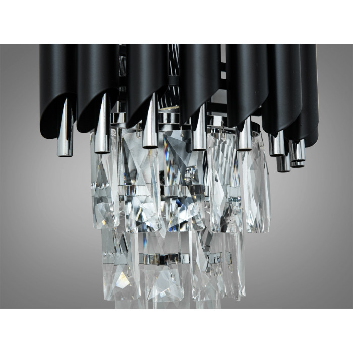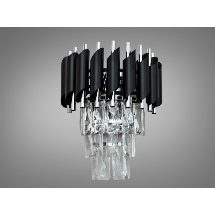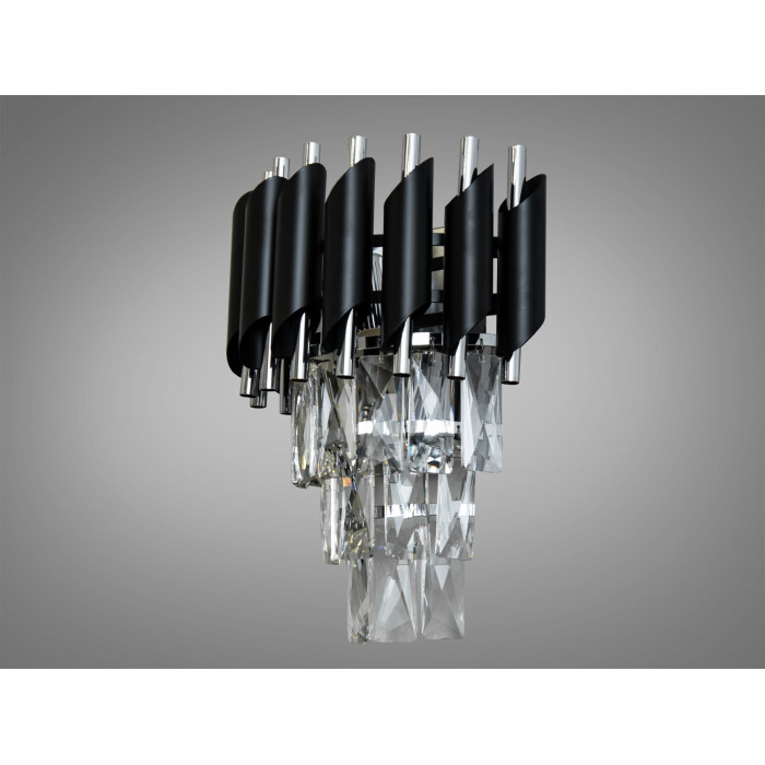 Матеріали: метал з чорним покриттям та хромованими деталями у поєднанні з прозорими кристалами. Таке рішення робить бра візуально легким, але помітним. Монтаж виконується на стіну; встановлення краще довірити кваліфікованому електрику з дотриманням норм безпеки.