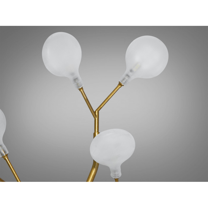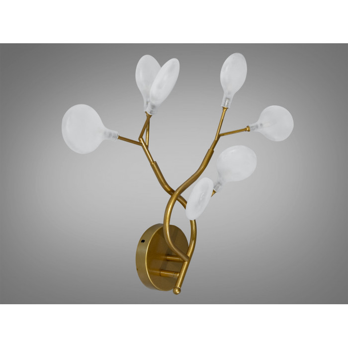 Зовнішній вигляд і конструкція. Розгалужені стрижні утворюють «гілочки», на яких розташовані скляні плафони-кульки з м’яким розсіюванням. Сатиноване золото виглядає стримано та може поєднуватися як з теплими, так і з нейтральними палітрами. Настінний монтаж економить простір і дозволяє використовувати бра там, де підвісні світильники недоречні.