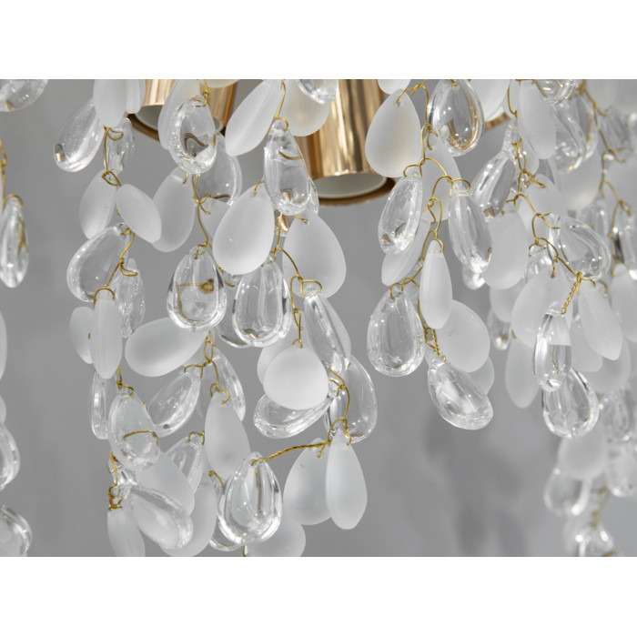 - Кришталеві підвіси краплеподібної форми поєднують прозорі та матові елементи, що може пом’якшувати відблиски і робити світло більш комфортним для очей.