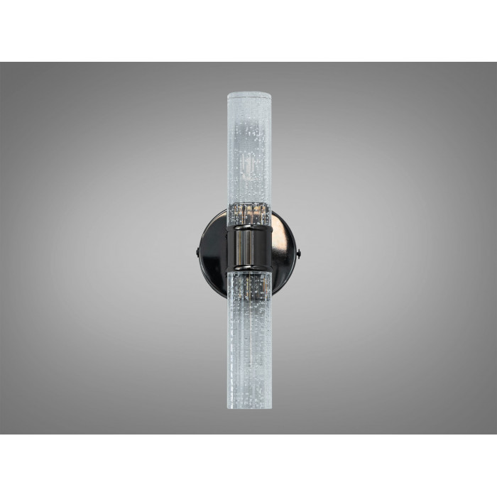 Конструкція поєднує металеве кріплення з покриттям чорний хром та прозорі кришталеві циліндричні плафони з бульбашковою фактурою. Таке рішення візуально «пом’якшує» світловий пучок і надає підсвічуванню декоративного характеру без зайвої яскравості. Кругла основа виглядає акуратно на стіні, а витягнуті циліндричні елементи вибудовують чітку вертикаль або горизонталь у площині інтер’єру. У більшості випадків монтаж дозволяє орієнтувати світильник вертикально або горизонтально — перед встановленням варто перевірити інструкцію та схему кріплення.