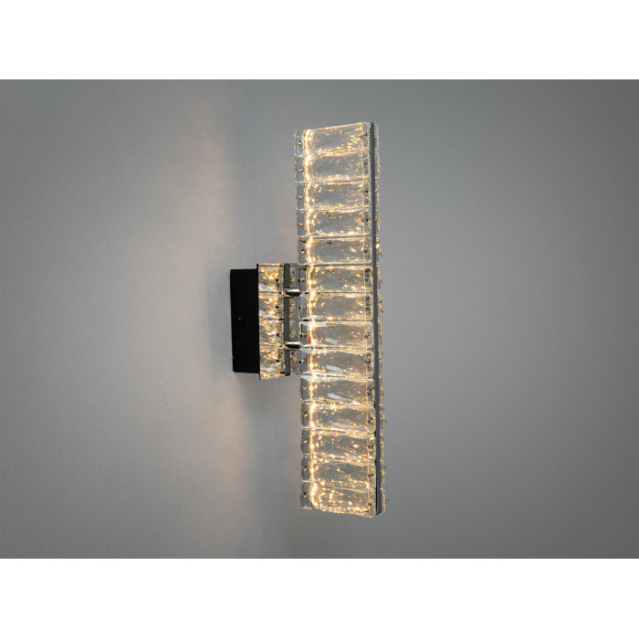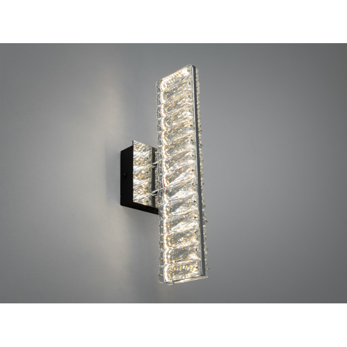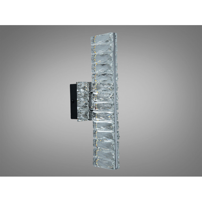 Настінне LED бра з кришталевим розсіювачем у хромі, 8 Вт створює виразний акцент і м’яке біле підсвічування для сучасних інтер’єрів. Прямокутний силует і прозоре кришталеве скло візуально «полегшують» стіну, а компактні габарити допомагають організувати локальне світло там, де це доречно: біля дзеркала, у коридорі, над узголів’ям ліжка або біля консолі.