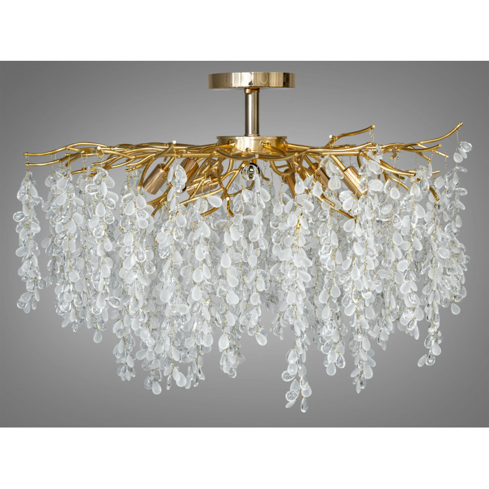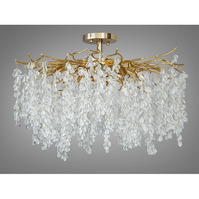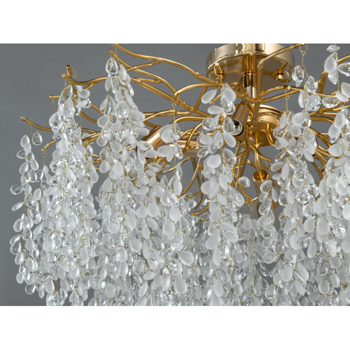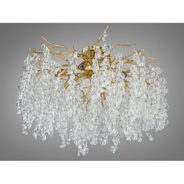 Чаруюча алюмінієва кришталева люстра "Гліцинія" у золотому виконанні - це справжній витвір мистецтва. Люстра має 9 патронів під лампи цоколя E14, що забезпечує її яскраве та рівномірне освітлення. Її конструкція нагадує розкішний каскад квітів гліцинії, які наче сплітаються у витончену композицію, створюючи неповторну гру світла та тіней.