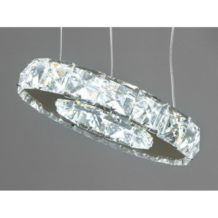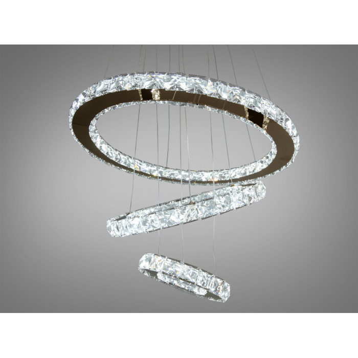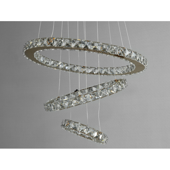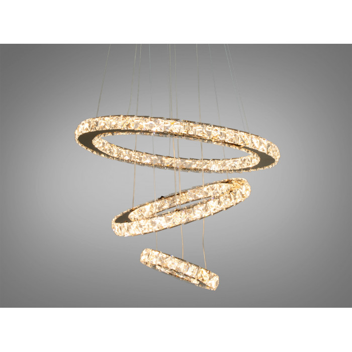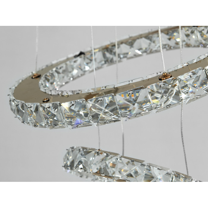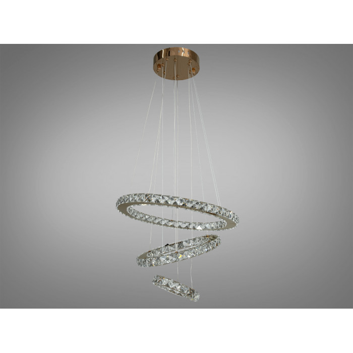 Стильна кришталева світлодіодна люстра на тросах підвісах має вишуканий дизайн, який вирізняється своїми асиметричними кільцями, що розташовані на різних рівнях. Вона надає інтер'єру легкості завдяки прозорим кришталевим вставкам, які переливаються під світлом вбудованих світлодіодів. Золота основа та кришталь додають їй вишуканого вигляду, що робить люстру особливо привабливою.