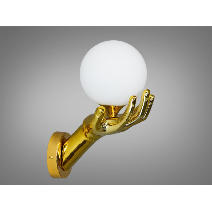 Цей настінний світильник — справжня прикраса інтер’єру, яка миттєво привертає увагу. Його елегантна форма у вигляді витонченої золотої руки, що ніжно тримає круглий матовий плафон, створює враження, ніби світло саме народжується в її долоні. Бра виконане з преміум-матеріалів, де кожна деталь говорить про вишуканий стиль і досконалість. Завдяки комбінації глянцевого золота й м’якого світла плафона, цей світильник виглядає як елемент сучасного мистецтва.