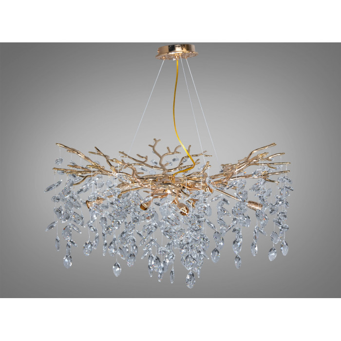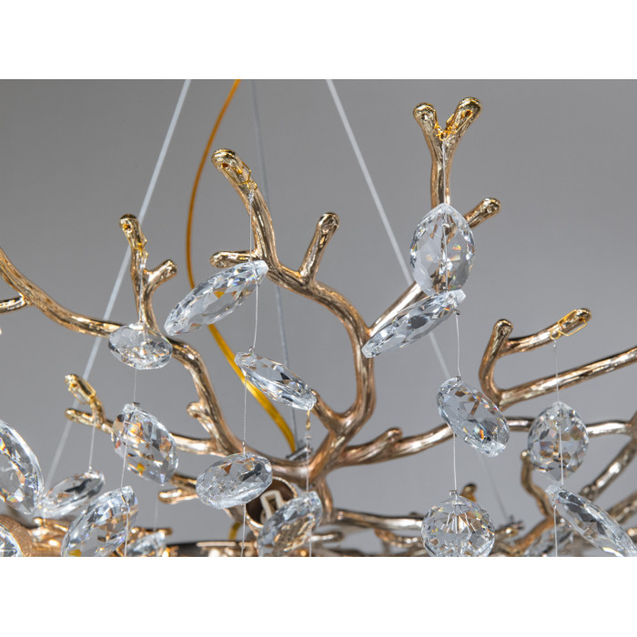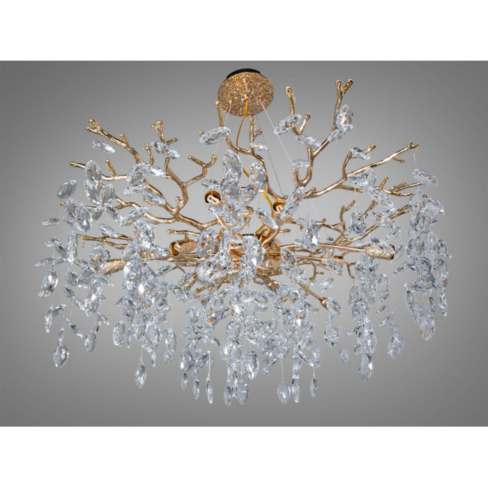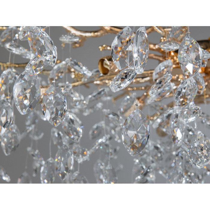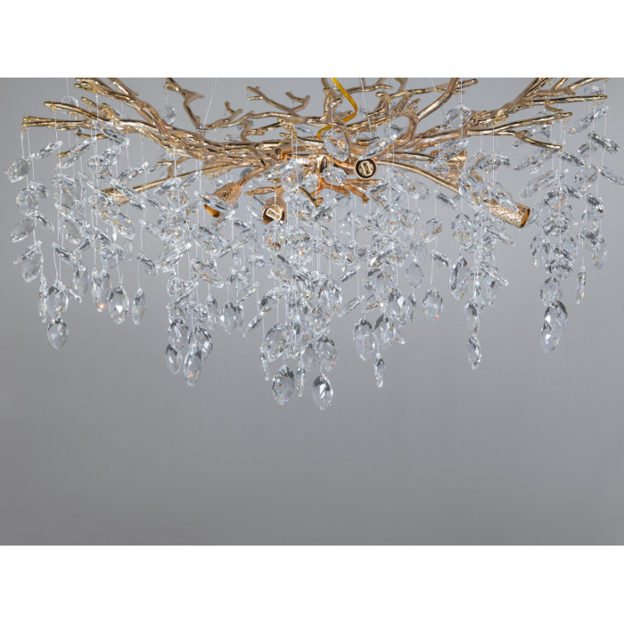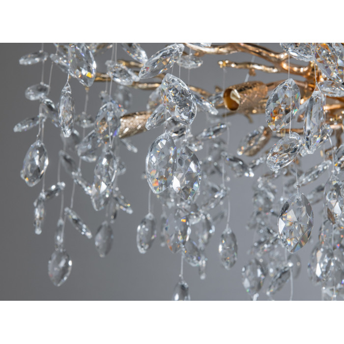 Дизайнерська підвісна кришталева люстра від ТМ "Діаша" вражає своєю витонченою красою та елегантністю. Її конструкція нагадує розгалужені гілки гліцинії, які прикрашені численними кришталевими підвісками у формі листків. Кожен кришталевий елемент майстерно відбиває світло, створюючи чарівні іскри та додаючи приміщенню неповторного шарму. Люстра виконана в кольорі хром, що надає їй сучасного та стильного вигляду.