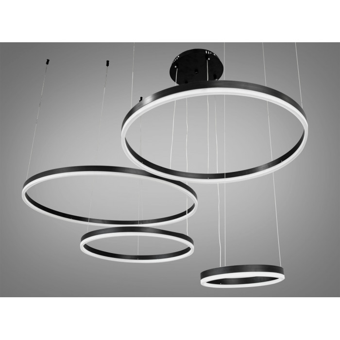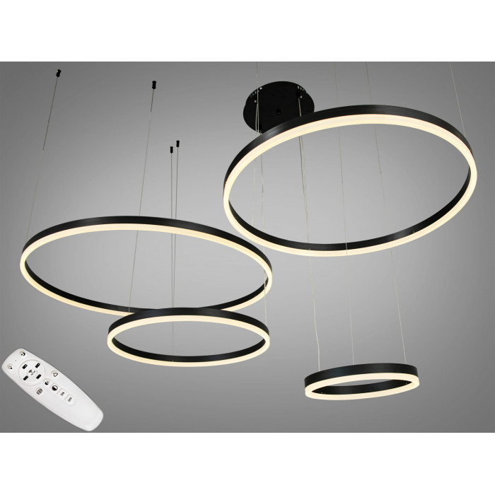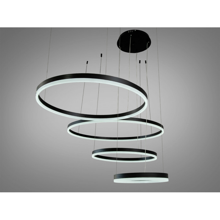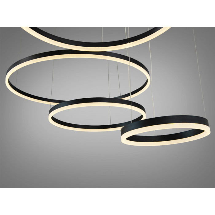 Лед люстра має чотири кільця різних діаметрів і виконана у чорному кольорі, що підкреслює її сучасний дизайн.