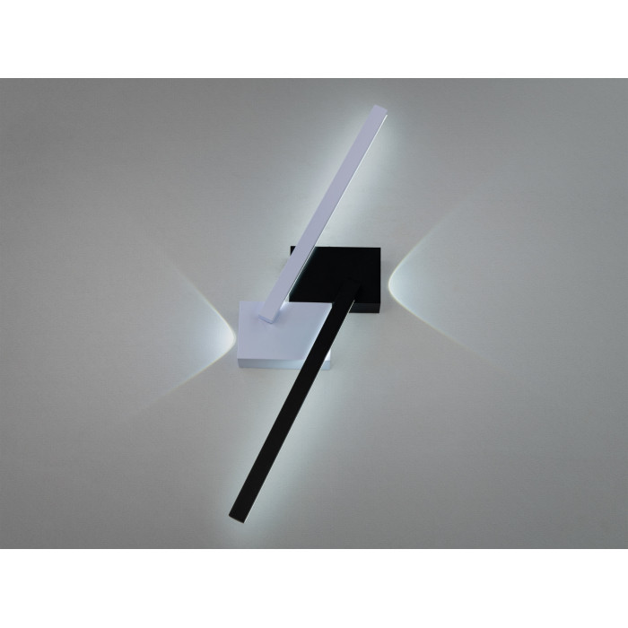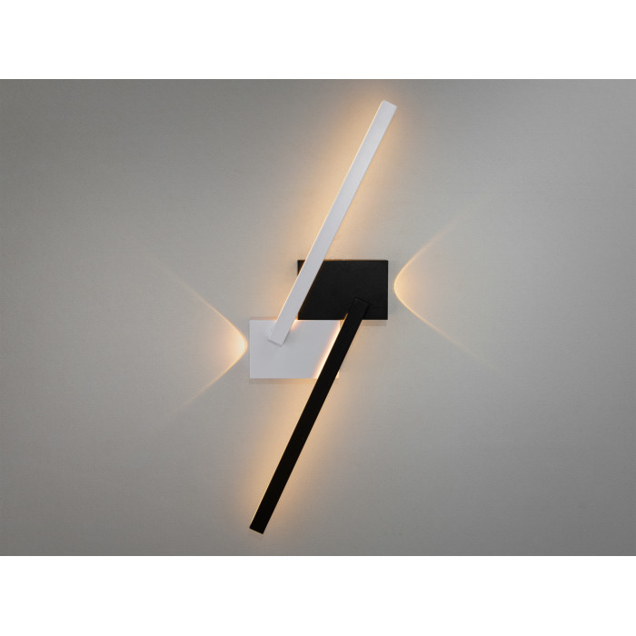 Це сучасне настінне світлодіодне бра — ідеальне втілення геометричної гармонії та функціонального дизайну. Модель у чорно-білій гамі має витончену конструкцію з двох перехресних ліній, які створюють візуальну динаміку та додають інтер'єру виразності. Чорний матовий і білий глянцевий елементи гармонійно контрастують між собою, підкреслюючи стильний вигляд лед світильника.