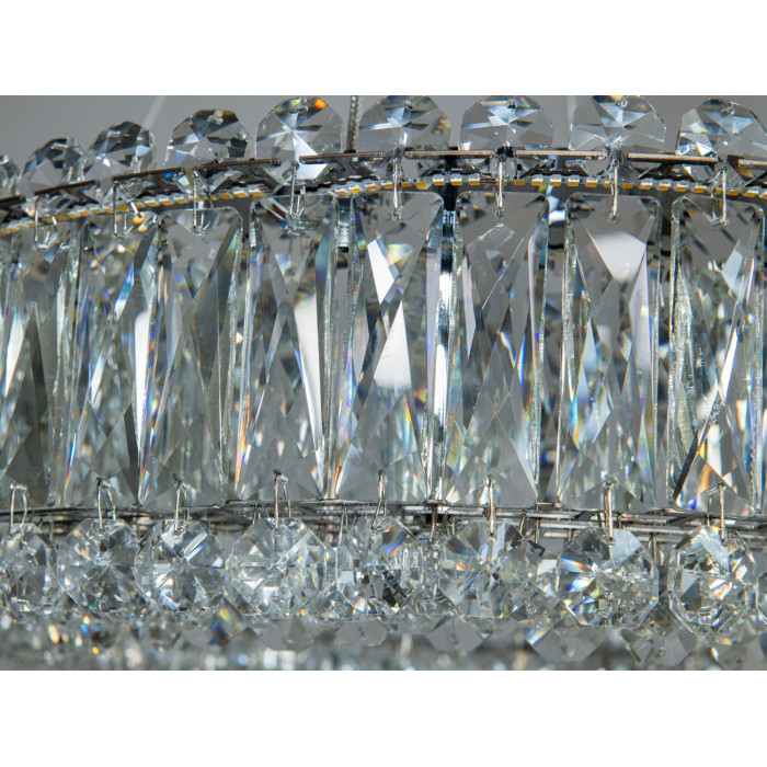 Спочатку кидається в очі її вишукана структура: хромовані металеві елементи люстри мають теплий відтінок, що контрастує з чистотою та прозорістю кришталів. Ця гармонія кольорів і матеріалів приносить в інтер′єр відчуття розкоші та тепла, що є особливо важливим в холодніші місяці.