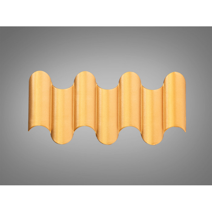 Корпус виконано з металу; вигнуті секції утворюють ритм з трьох напівциліндрів, що допомагає рівніше розподіляти світловий потік уздовж площини стіни. Бронзове покриття додає теплих відтінків і поєднується з природними матеріалами — деревом, каменем, клінкером. Джерелом світла виступає LED підсвітка потужністю близько 5 W, якої зазвичай достатньо для декоративного підкреслення зон без зайвого споживання електроенергії. Схема up down спрямовує промені догори та донизу, зменшуючи кількість прямого світла в очі та формуючи охайні світлові плями.