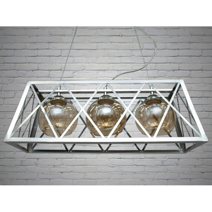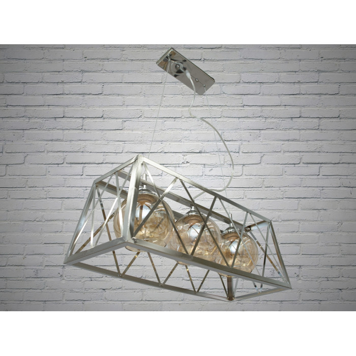 Люстра має прямокутну форму з хромованого металу, що додає їй індустріального вигляду. Каркас люстри складається з металевих пластин, які формують ґратчасту конструкцію навколо трьох скляних плафонів. Такий дизайн створює ефект легкої прозорості та дозволяє світлу вільно розповсюджуватися по приміщенню, створюючи м'яке, розсіяне освітлення.
