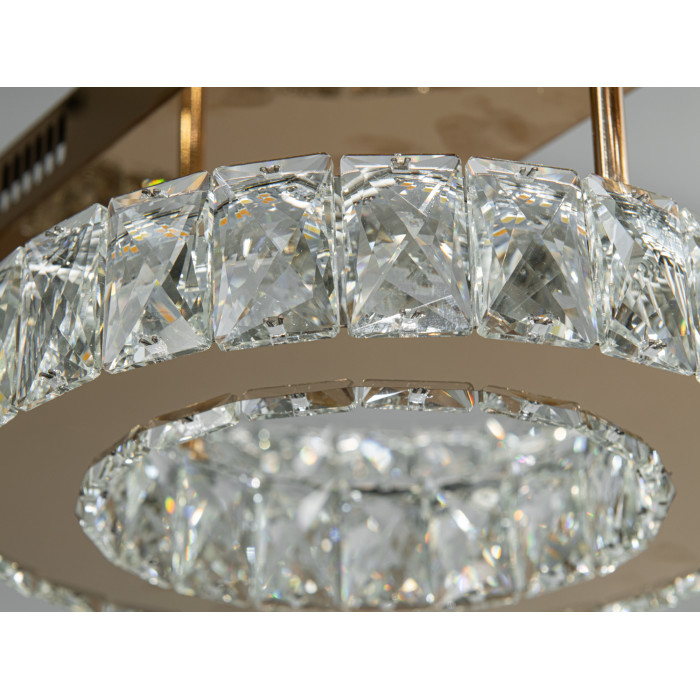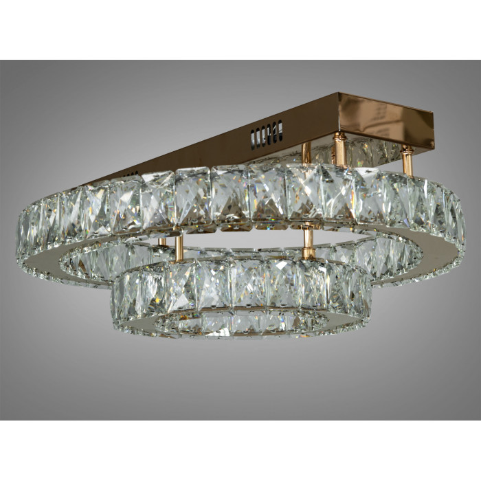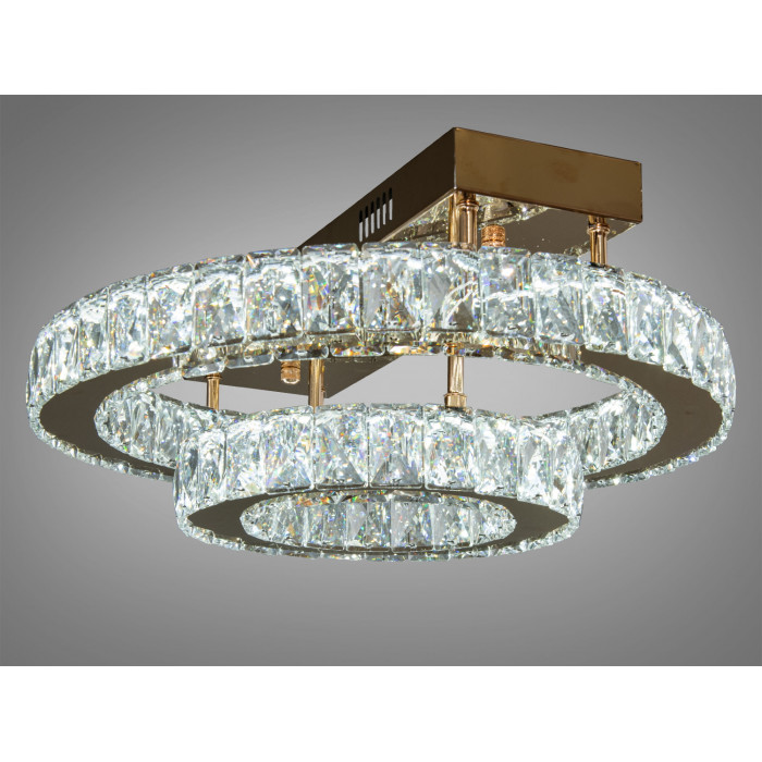 Гармонійна стельова кришталева LED люстра від ТМ "Діаша" потужністю 40 W з металевою основою в золотому кольорі. Її дизайн відрізняється сучасністю та елегантністю, що робить її ідеальним доповненням до будь-якого інтер'єру. Люстра складається з двох круглих елементів різного діаметру, що розташовані на різних рівнях, створюючи ефект багатошаровості.