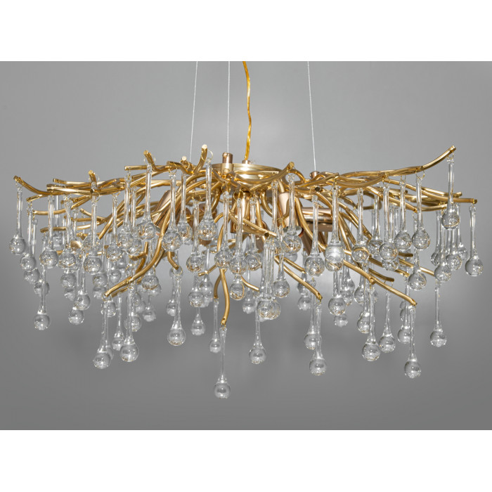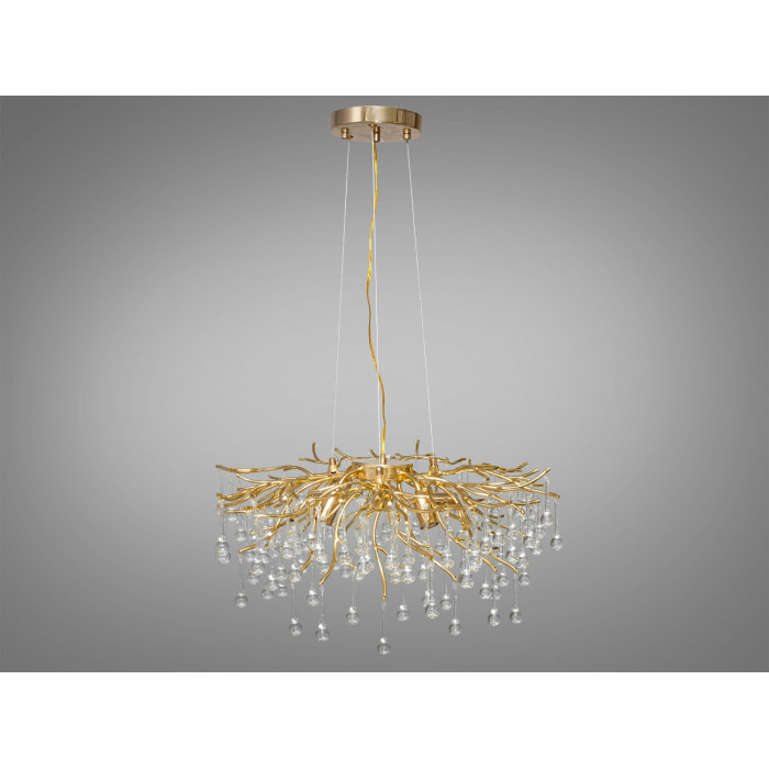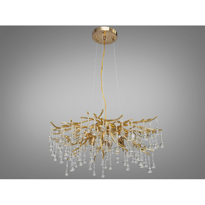 Основа люстри виконана з майстерно витих металевих гілок, кожна з яких увінчана вертикально розташованою гірляндою з цих кришталів. Це додає люстрі вишуканості та витонченості, роблячи її ідеальним вибором для створення особливої атмосфери у вашому інтер'єрі.