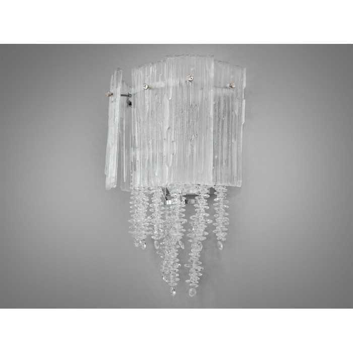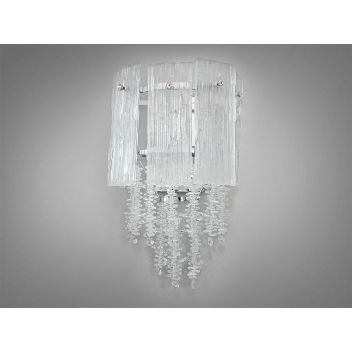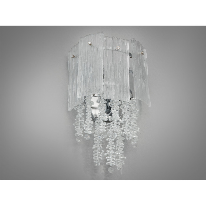 Верхня частина бра складається з декоративних частин, що нагадує замерзлі візерунки на кришталю, підкреслюючи витонченість та оригінальність дизайну. Нижня частина світильника прикрашена каскадами багатогранних криштальних підвісок, які дивовижно переломлюють світло, створюючи блискучий спектакль світлових відблисків.