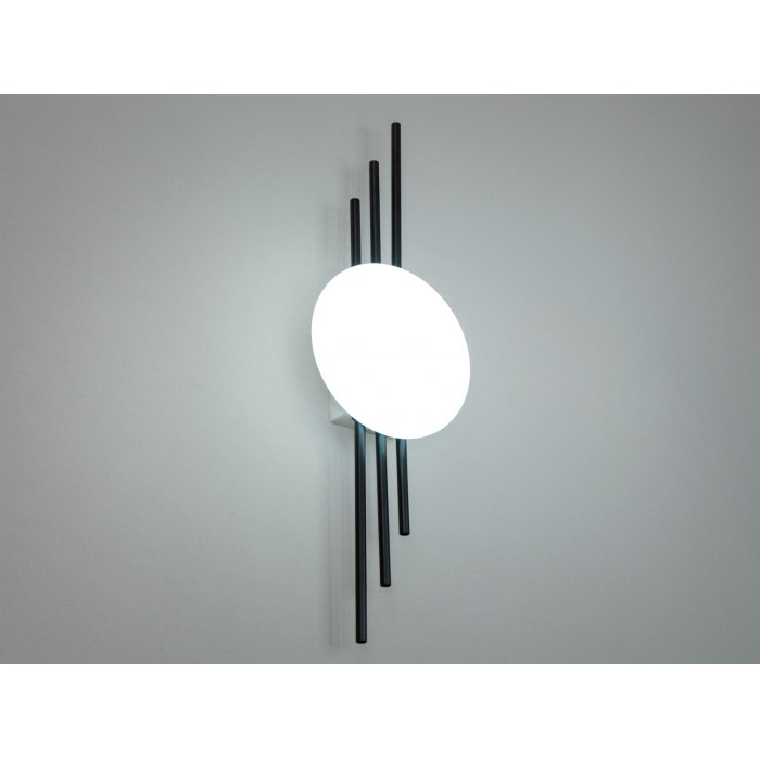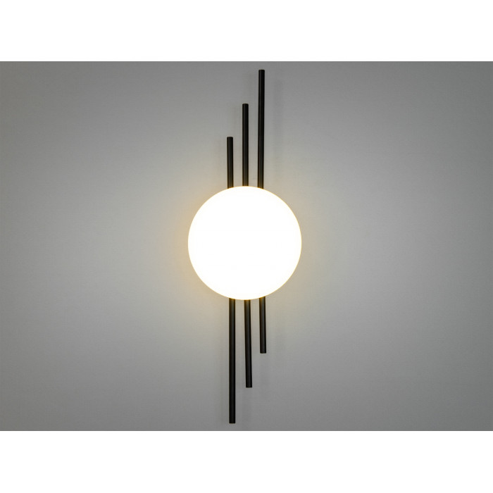 Цей світлодіодний настінний світильник вражає своєю елегантною простотою і функціональністю. Центральний елемент — біла матова куля, яка випромінює м'яке, рівномірне світло, ідеально підходить для створення комфортної робочої атмосфери. Тонкі чорні металеві стрижні, що оточують кулю, надають дизайну строгості та гармонії, роблячи цей світлодіодний настінний світильник універсальним вибором для кабінетів, робочих зон або просторів, де потрібна зосередженість.