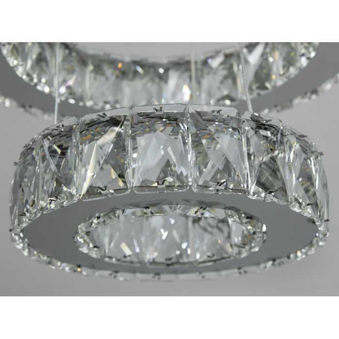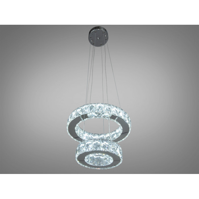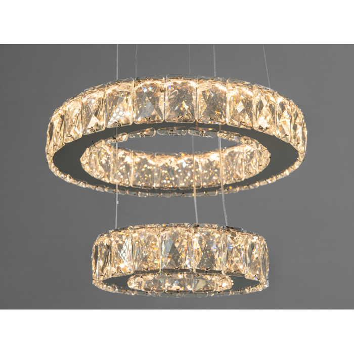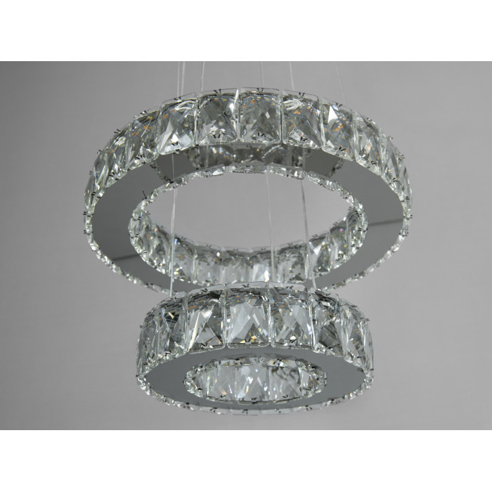 Люстра з фото, гламурна підвісна кришталева світлодіодна люстра для спальні потужністю 30 Вт з хромованими елементами. Люстра має сучасний дизайн з двома кільцями різного діаметру, які висять один над одним, створюючи візуальний ефект динаміки та витонченості. Кожне кільце обрамлене блискучими кришталевими елементами, які додають люстрі розкішного вигляду, відбиваючи та розсіюючи світло у всі боки.