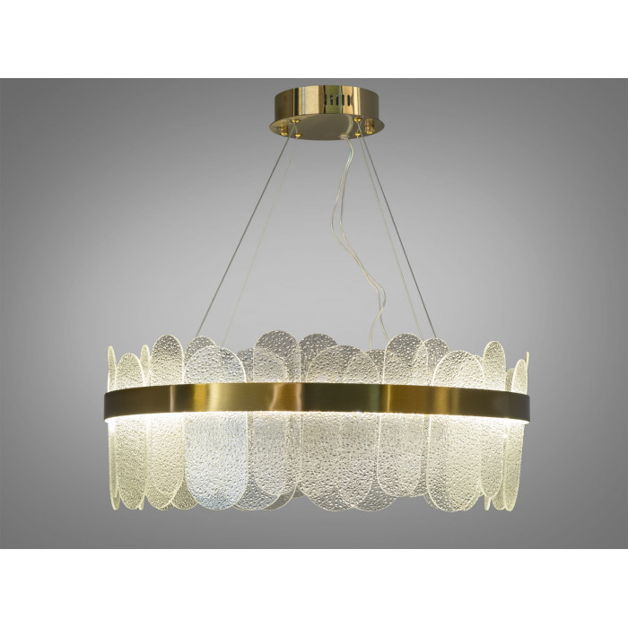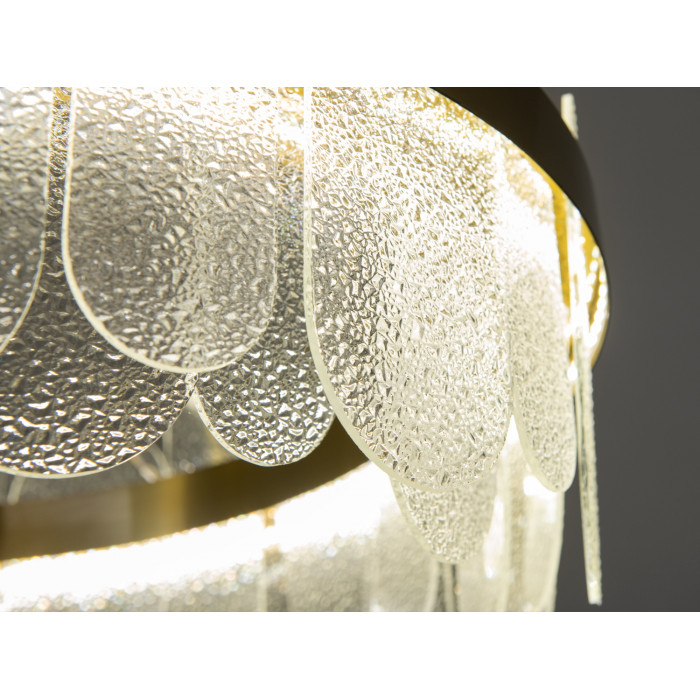 Вона має виразний круглий силует, який огортає простір світлом, додаючи йому відчуття величі та відкритості. Золотистий металевий обід надає конструкції вишуканості та доповнює блиск кришталів, що висять в ніжних, рівних рядах, ніби льодяні брили, що ваблять своєю чистотою та свіжістю.