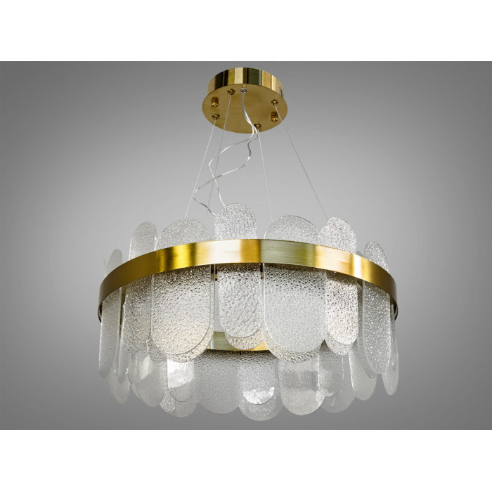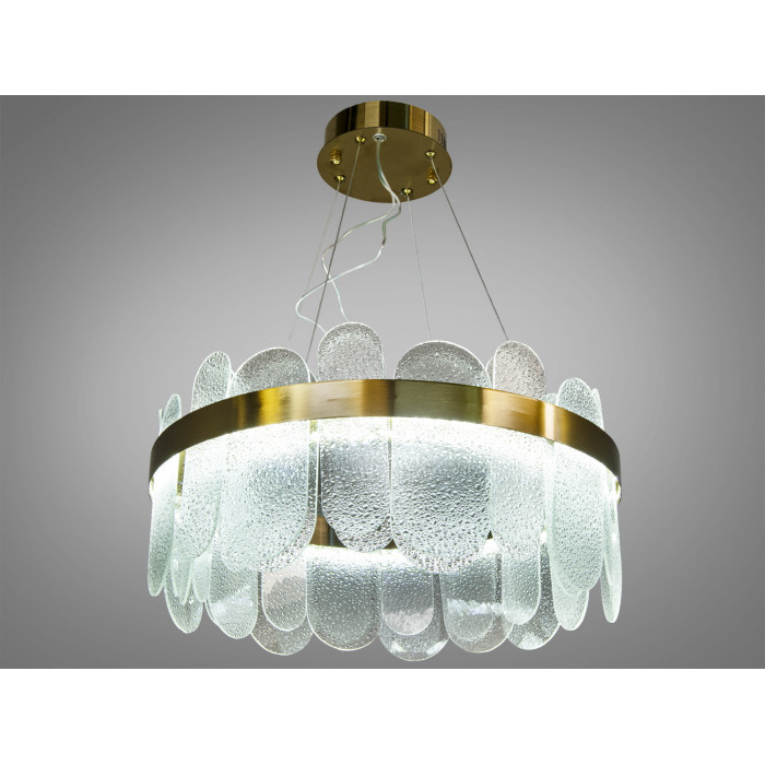 Люстра виділяється своєю круглою формою, доповненою елегантним золотистим металевим обідком. Прозорі кришталеві підвіски, схожі на льодяники, створюють ефект чарівного блиску, відбиваючи світло та додаючи інтер′єру відчуття багатства та світла.