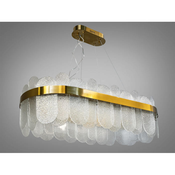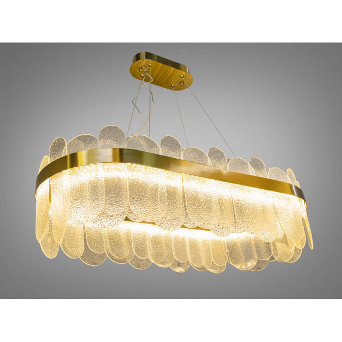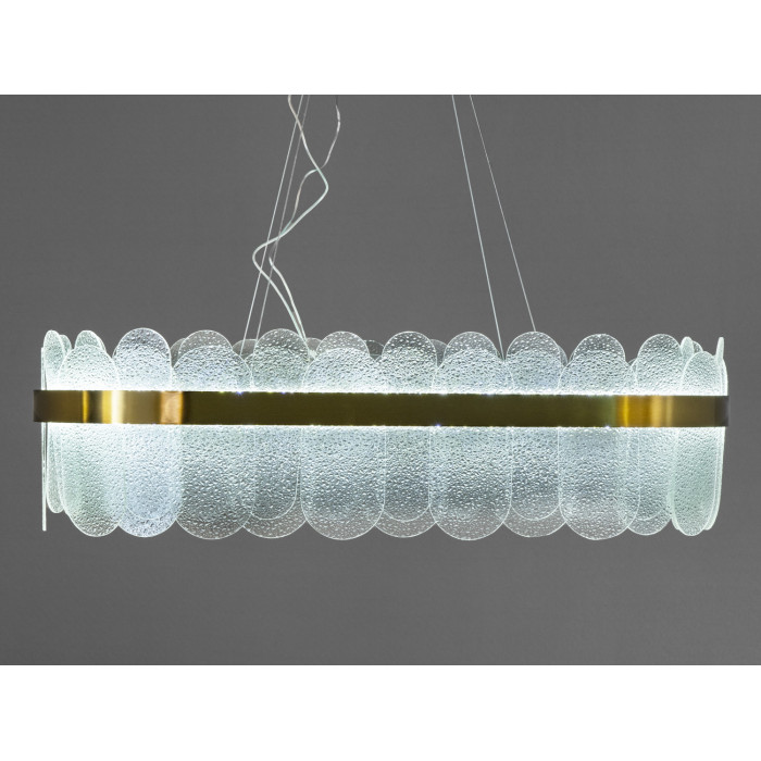 Люстра виділяється своєю круглою формою, доповненою елегантним золотистим металевим обідком. Прозорі кришталеві підвіски, схожі на льодяники, створюють ефект чарівного блиску, відбиваючи світло та додаючи інтер′єру відчуття багатства та світла.