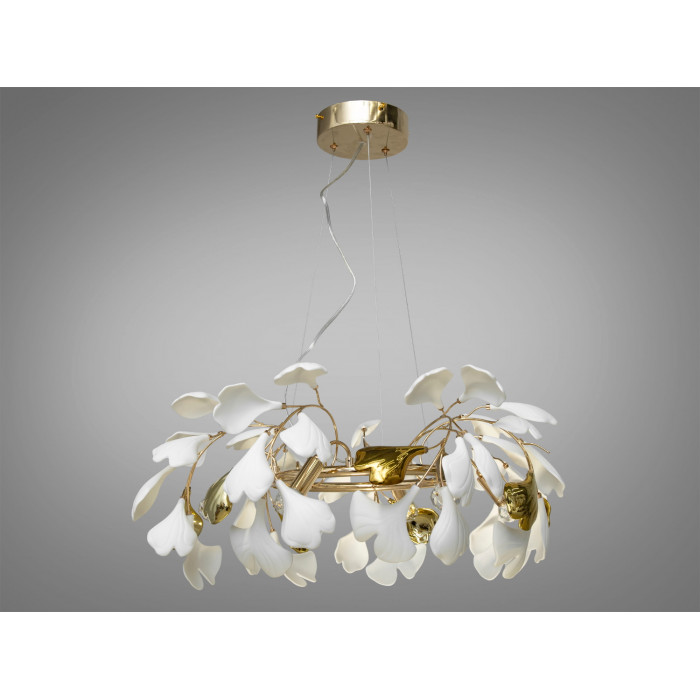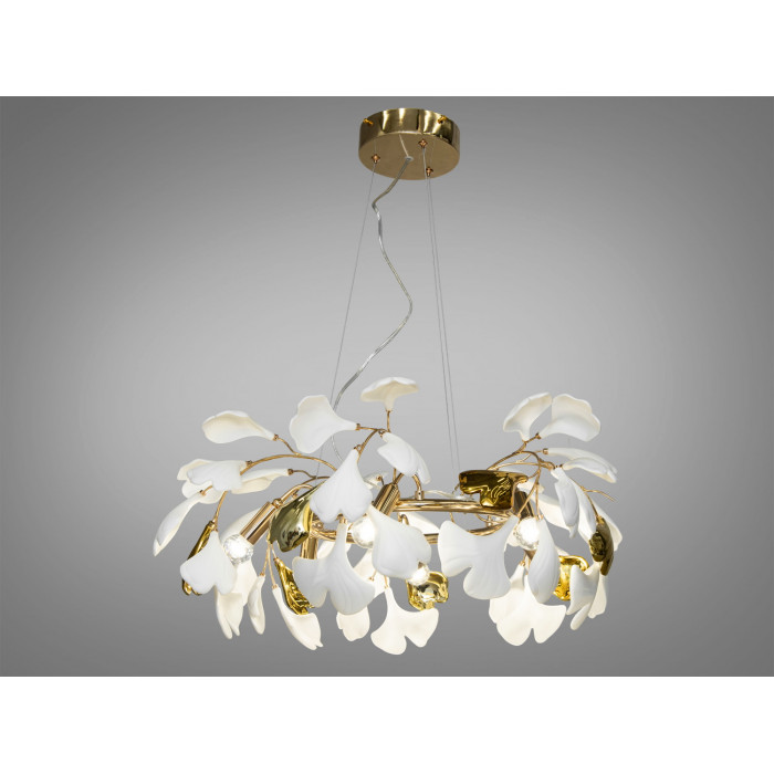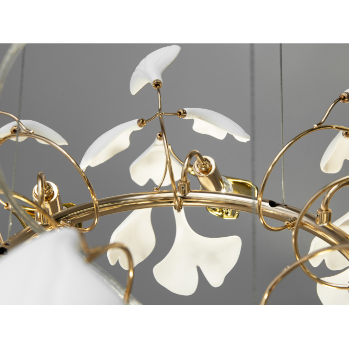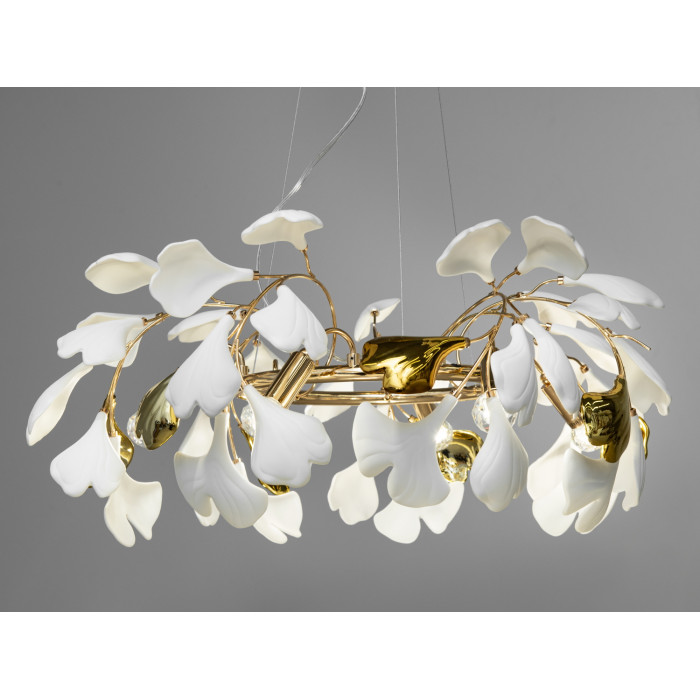 Міцний металевий каркас люстри служить надійною основою для розкішних керамічних пелюсток, форма яких навіяна листям Гінкго Білоба – символом мудрості та довголіття. Неглазуровані білі фарфорові пелюстки з текстурою, яка нагадує мармур античних палаців, додають інтер'єру відчуття стабільності, благородства та історичної глибини. При цьому, глазуровані елементи з ефектом металіку у золотих та хромованих кольорах вносять до дизайну свіжі сучасні акценти, створюючи блискучий візуальний контраст, який оживляє простір та додає йому витонченості.