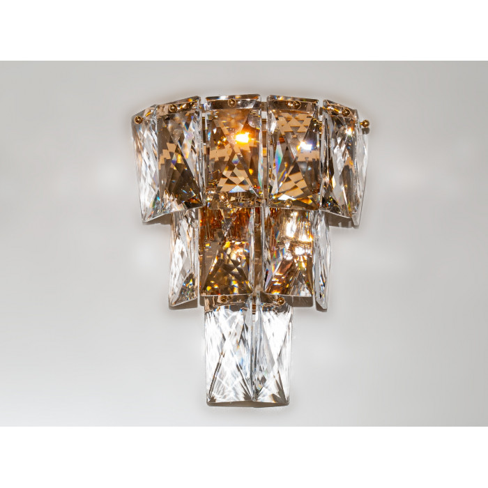 Металева основа бра має золотисте покриття, що надає йому вишуканий вигляд та забезпечує ідеальне поєднання із кришталевими деталями. Стиль золотистого бра ідеально підходить до інтер'єрів, де переважають чисті лінії, блискучі поверхні та мінімалістичні візерунки, вносячи в них відчуття статусу та витонченості.