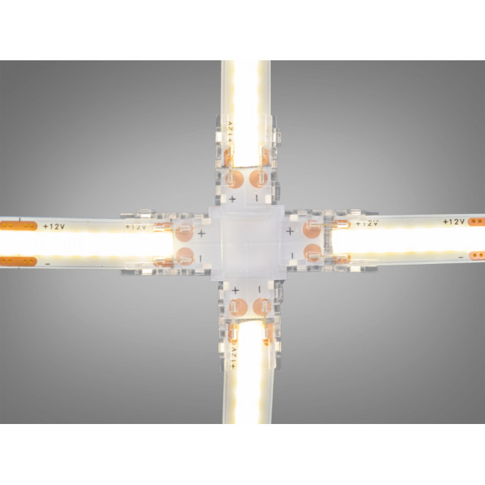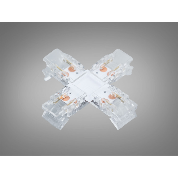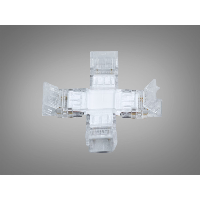 Універсальний конектор для світлодіодних стрічок шириною 8 мм з пробивним механізмом контактів розроблений для надійного, швидкого та безпаяльного з’єднання одноколірних SMD і COB LED стрічок. Його напівпрозорий корпус дозволяє візуально контролювати якість з′єднання та робить процес монтажу максимально зручним.