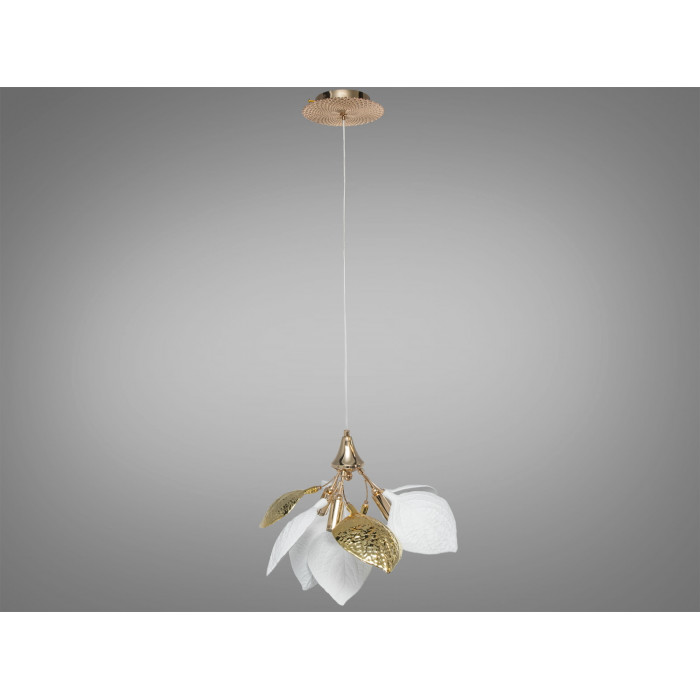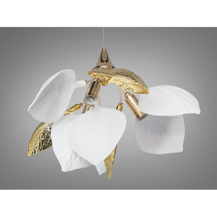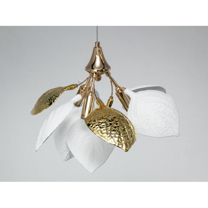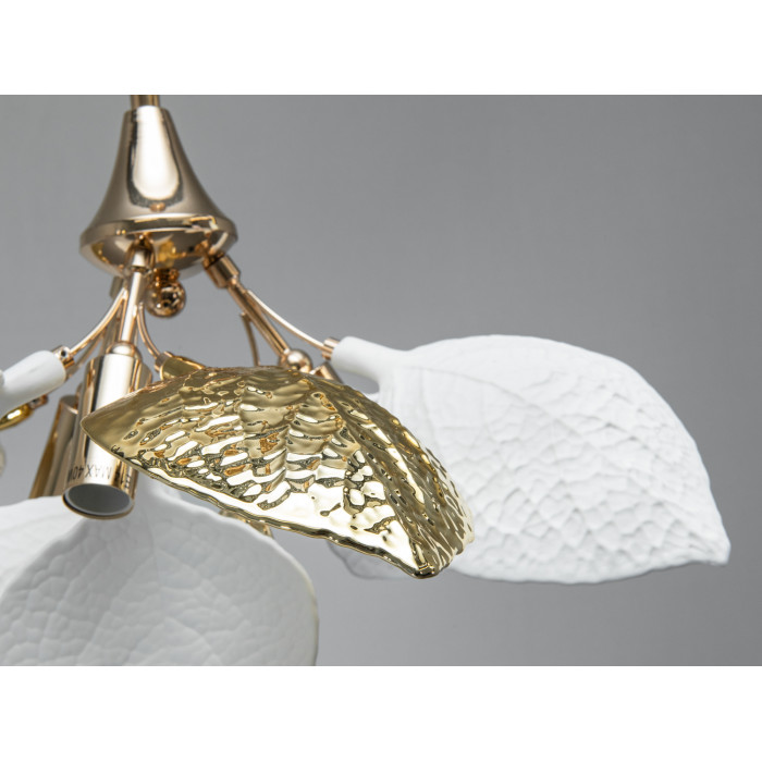 Люстра з фарфоровими елементами для вишуканого декору. Керамічні елементи білого кольору створюють ефект природної легкості, гармонійно контрастуючи із золотими деталями.