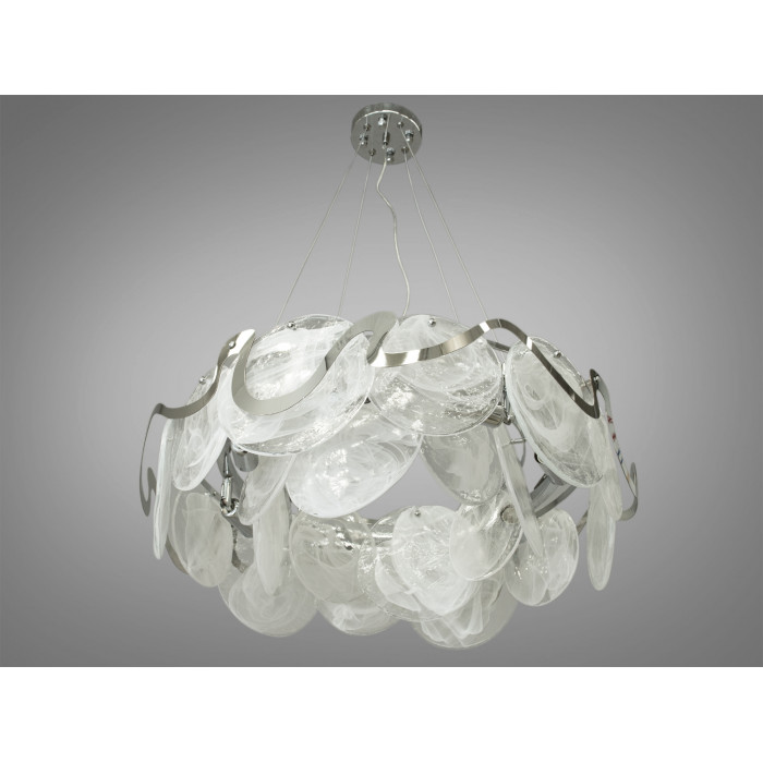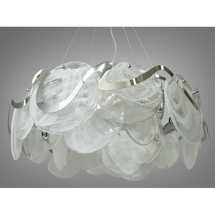 Люстра має діаметр 60 см та висоту, що регулюється до 115 см, що дозволяє їй граційно зависати в просторі, наче легка хмара на срібному світанку. Хромована основа додає структурі сучасність, нагадуючи про сонячне світло, що пробивається крізь туман, м'яко огортає долину в ранкові години.