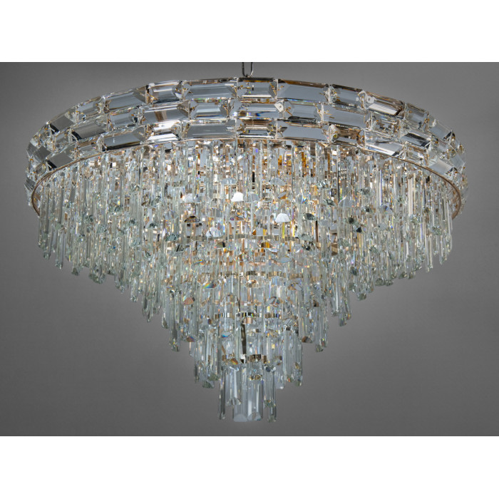 Люстра B9085-800GD від українського бренду «Діаша» - це символ розкоші та елегантності. Її діаметр 80 см разом з 19 патронами E14 забезпечують інтенсивне і рівномірне освітлення у великих кімнатах. Каскад кришталевих призм створює ефект мерехтливого водоспаду, додаючи приміщенню шарму і вишуканості.