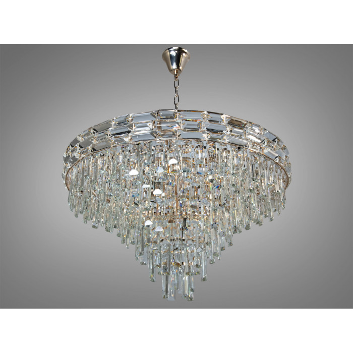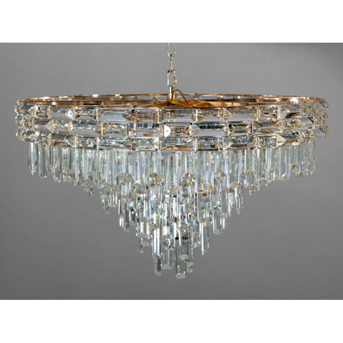- Багаторівневі підвіси з прозорих кришталевих призм формують конус, що розсіює світло в усі боки.