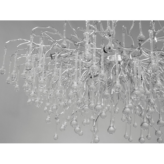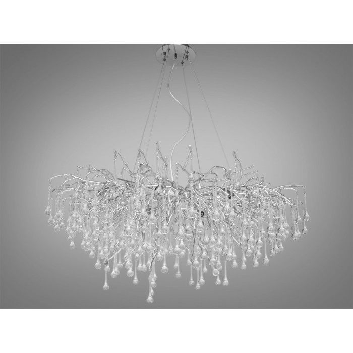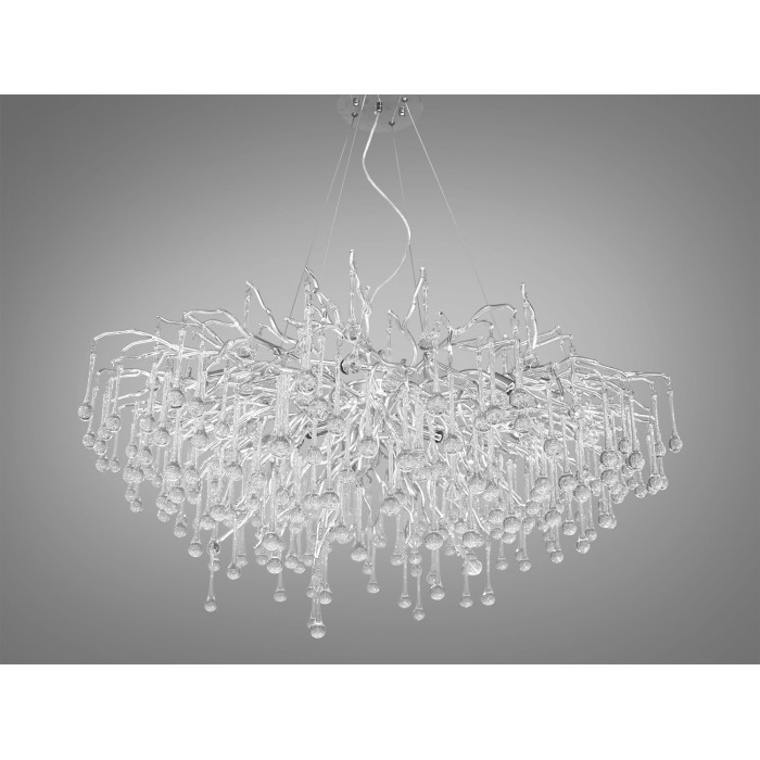 Нова, ексклюзивна кришталева люстра від ТМ «Діаша», з її ніжними хромованими гілками та кришталевими краплями, нагадує чарівний хромований дощ в серці лісу, де кожна краплина світла танцює з листям на сонці. Вона несе в собі душу весняного ранку, коли природа прокидається від сну, і кожна крапля роси переливається всіма барвами веселки.