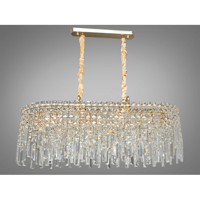 Завдяки овальній конструкції, люстра епіцентр будь-якої кімнати, від зали до вітальні, де її довгаста форма допомагає створити ілюзію вищого стелі та більшого простору. Підвісні елементи на золотистих шнурах додають індивідуальності та художньої виразності, дозволяючи цій люстрі стати справжньою окрасою дому.