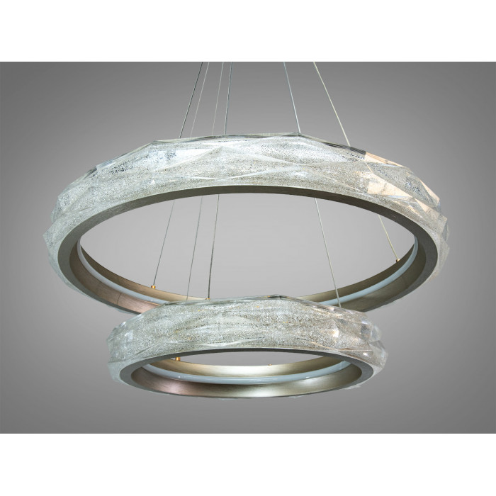 Починаючи з верхнього кришталевого кільця діаметром 57 см, що граційно спускається донизу, кожне наступне кільце вражає своєю елегантністю і пропорційністю. Два рівновіддалених кільця, які послідовно зменшуються, створюють враження легкості і гармонії. Кожне кришталеве кільце додає вишуканості і розкоші до всього дизайну.