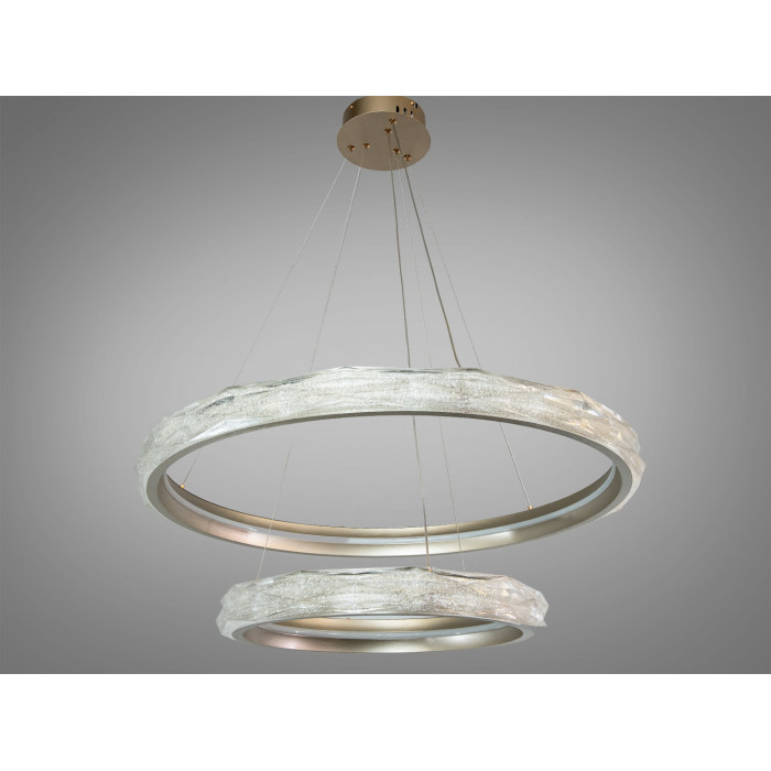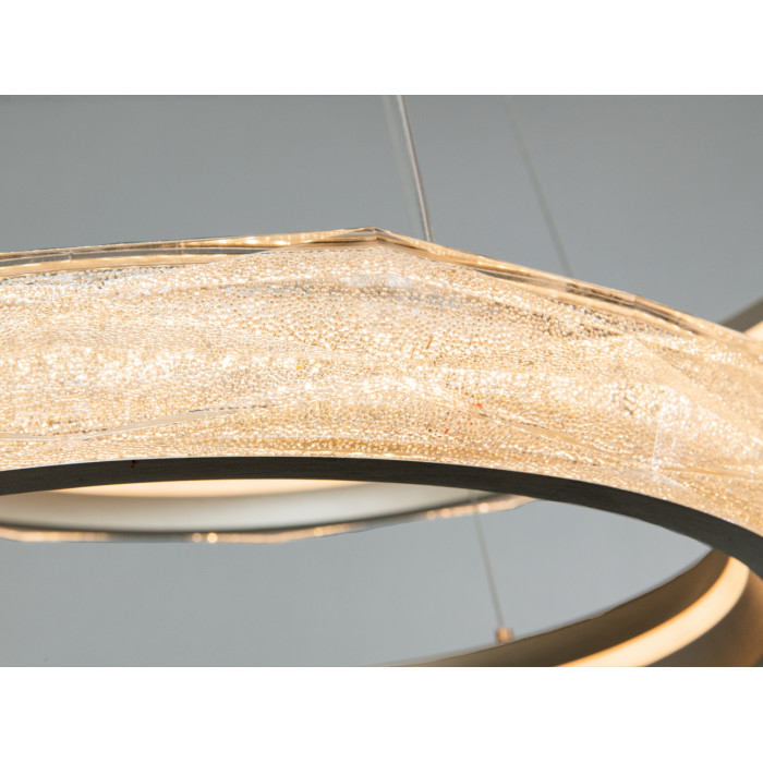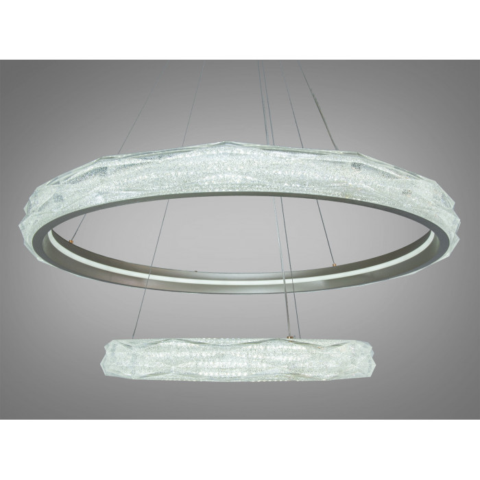 Починаючи з верхнього кришталевого кільця діаметром 57 см, що граційно спускається донизу, кожне наступне кільце вражає своєю елегантністю і пропорційністю. Два рівновіддалених кільця, які послідовно зменшуються, створюють враження легкості і гармонії. Кожне кришталеве кільце додає вишуканості і розкоші до всього дизайну.