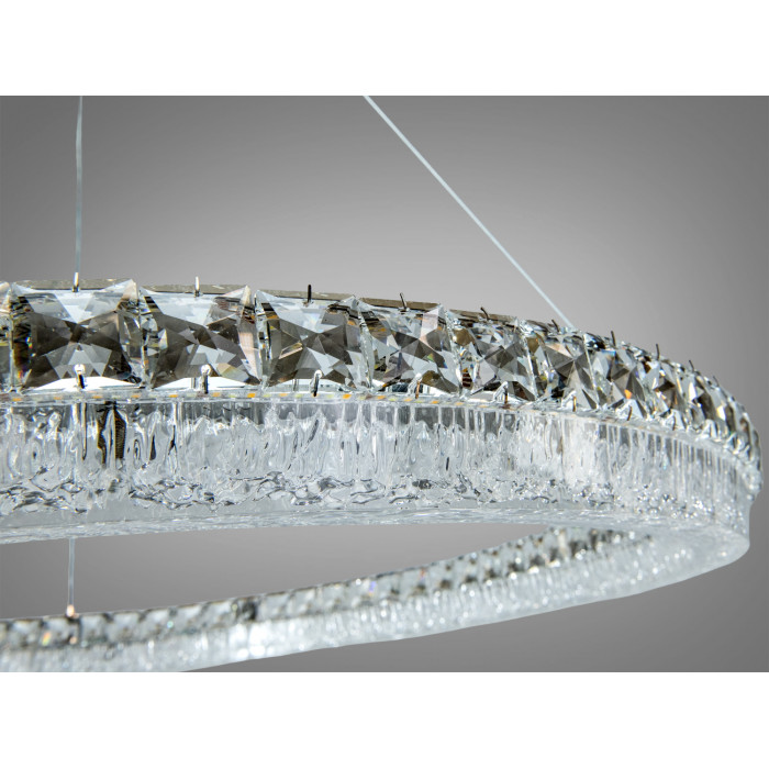 Починаючи з верхнього кришталевого кільця діаметром 57 см, що граційно спускається донизу, кожне наступне кільце вражає своєю елегантністю і пропорційністю. Два рівновіддалених кільця, які послідовно зменшуються, створюють враження легкості і гармонії. Кожне кришталеве кільце додає вишуканості і розкоші до всього дизайну.