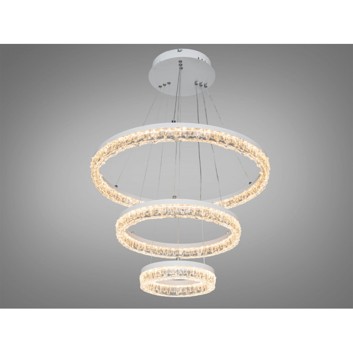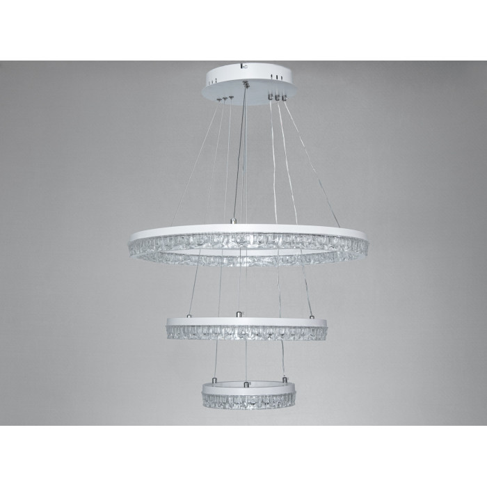 Світлодіодна підвісна люстра Diasha MD78200 з трьома кільцями поєднує рівномірне базове освітлення та кольорову підсвітку з кількома ефектами. Білий металевий корпус виглядає стримано, легко поєднується як зі світлими, так і з контрастними стелями, а підвісна конструкція дозволяє відрегулювати висоту під час монтажу. Потужність близько 105 Вт зазвичай підходить для кімнат орієнтовно до 18 м² за умови стандартної висоти стелі та середньої світловідбивної здатності оздоблення. Артикул: MD78200-600+400+200WH.