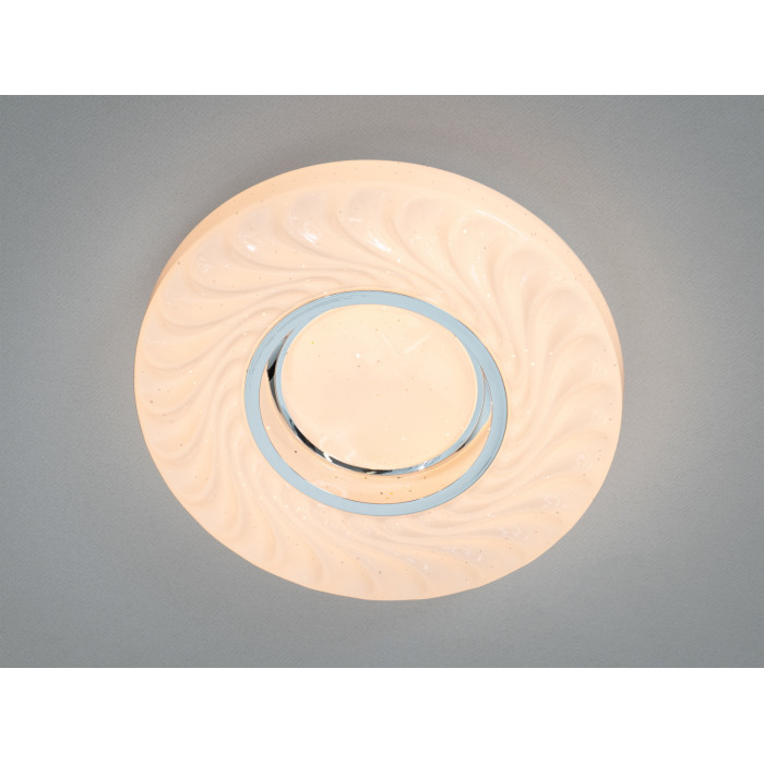 Кругла накладна люстра з хромованою окантовкою і матовим акриловим плафоном формує м′яке, рівномірне світло без різких тіней. Конструкція за форм-фактором близька до світлодіодної панелі, тому світильник виглядає акуратно, не перевантажує стелю та зручно монтується в кімнатах із невисокими стелями. Потужність 22 Вт зазвичай достатня для комфортного освітлення простору приблизно 8–10 м². Модель працює без пульта і не потребує додатків: керування відбувається звичайним настінним вимикачем.