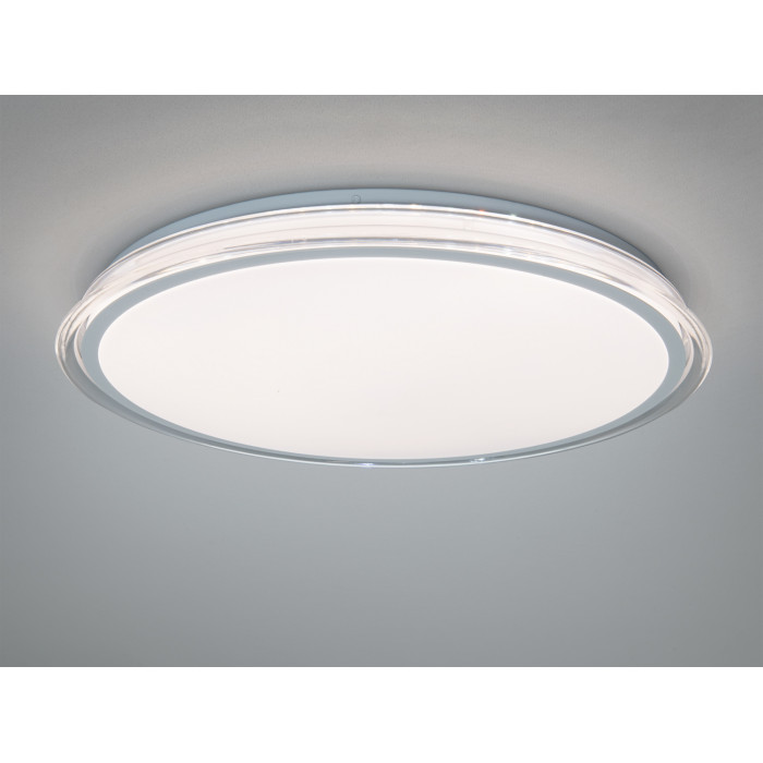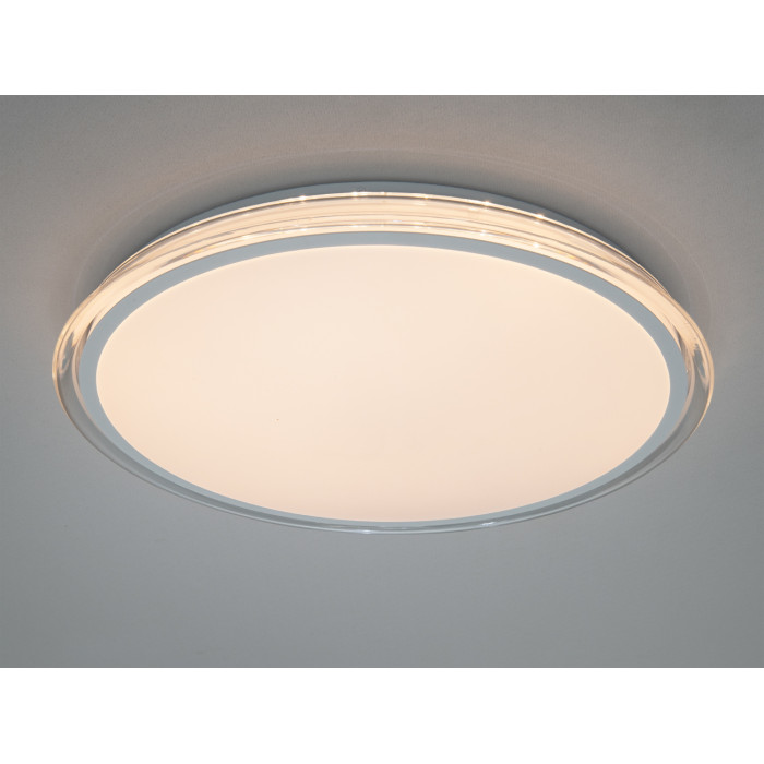 Кругла накладна люстра з хромованою окантовкою і матовим акриловим плафоном формує м′яке, рівномірне світло без різких тіней. Конструкція за форм-фактором близька до світлодіодної панелі, тому світильник виглядає акуратно, не перевантажує стелю та зручно монтується в кімнатах із невисокими стелями. Потужність 58 Вт зазвичай достатня для комфортного освітлення простору приблизно 8–10 м². Модель працює без пульта і не потребує додатків: керування відбувається звичайним настінним вимикачем.