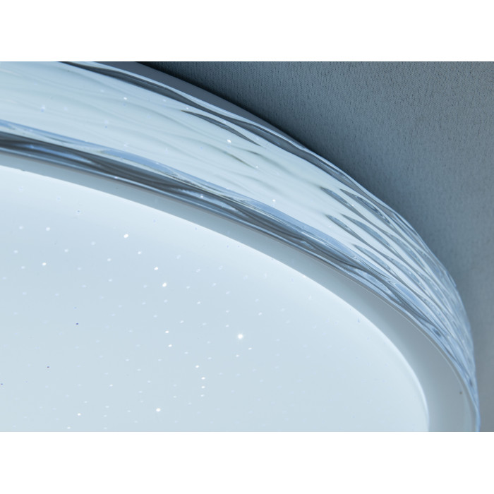 Кругла накладна люстра з хромованою окантовкою і матовим акриловим плафоном формує м′яке, рівномірне світло без різких тіней. Конструкція за форм-фактором близька до світлодіодної панелі, тому світильник виглядає акуратно, не перевантажує стелю та зручно монтується в кімнатах із невисокими стелями. Потужність 85 Вт зазвичай достатня для комфортного освітлення простору приблизно 10–15 м². Модель працює без пульта і не потребує додатків: керування відбувається звичайним настінним вимикачем.