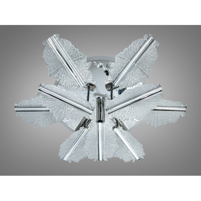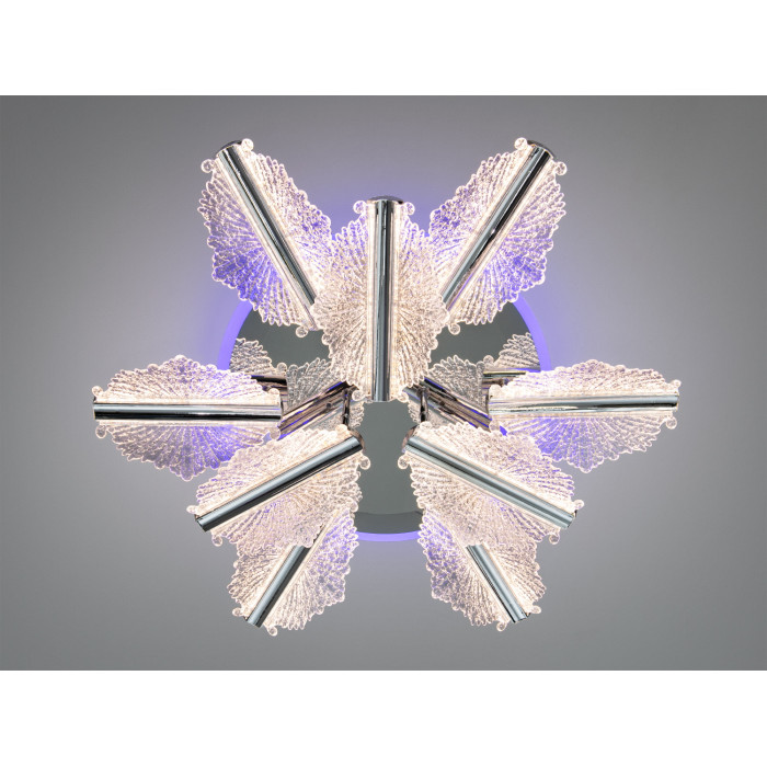Стельова світлодіодна люстра у кольорі хром формує виразний центр кімнати завдяки квітковій формі та прозорим акриловим елементам. Конструкція поєднує 9 акрилових модулів, серед яких п’ять нагадують пелюстки, створюючи м’яке розсіяне світло без різких тіней. Лаконічний хромований відтінок і компактний профіль роблять модель доречною в інтер’єрах від мінімалізму до сучасної класики.